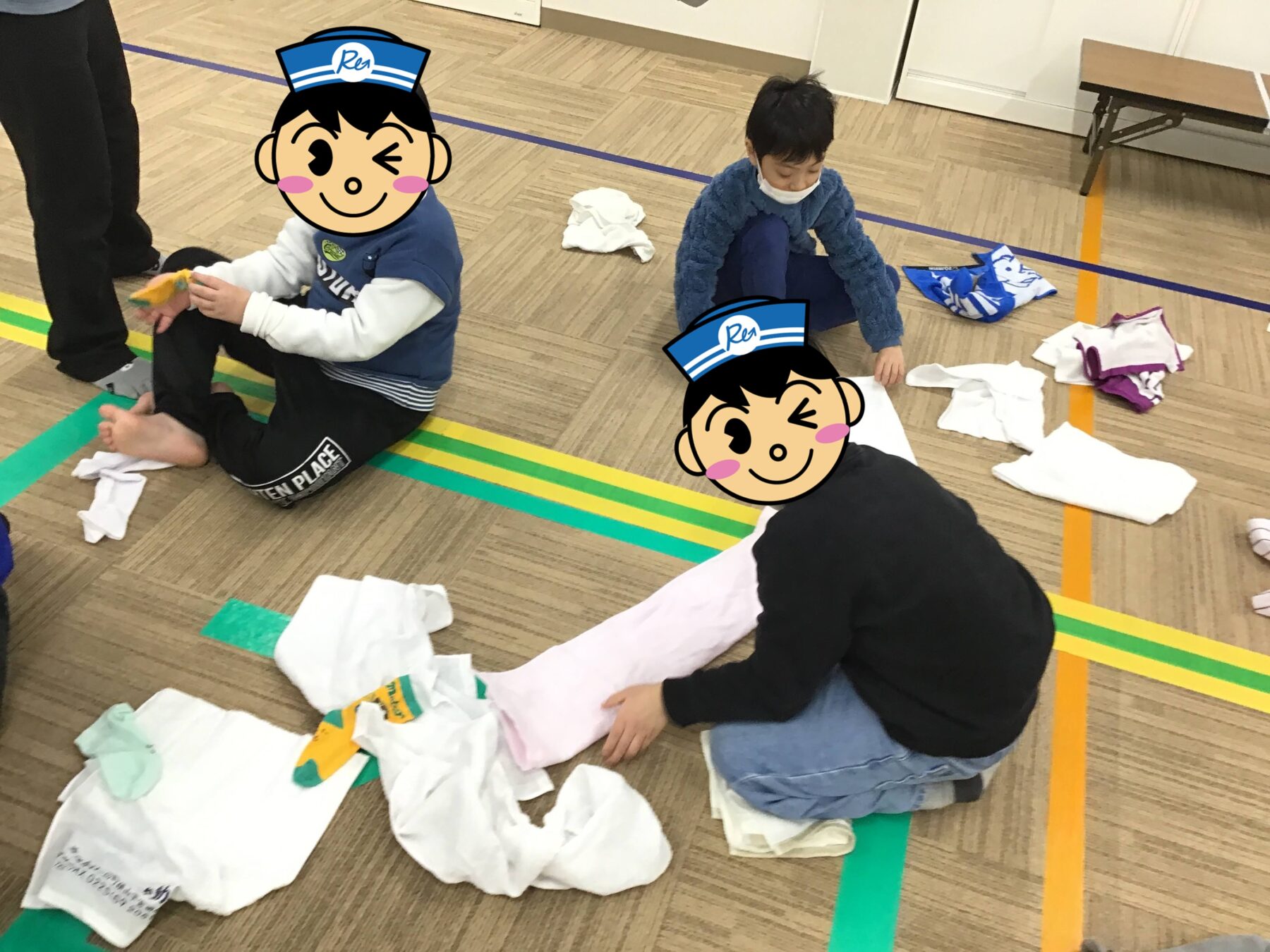 裏返しの衣服・バラバラになった靴下・広げたタオルをチームで協力してを畳んでいただきました。