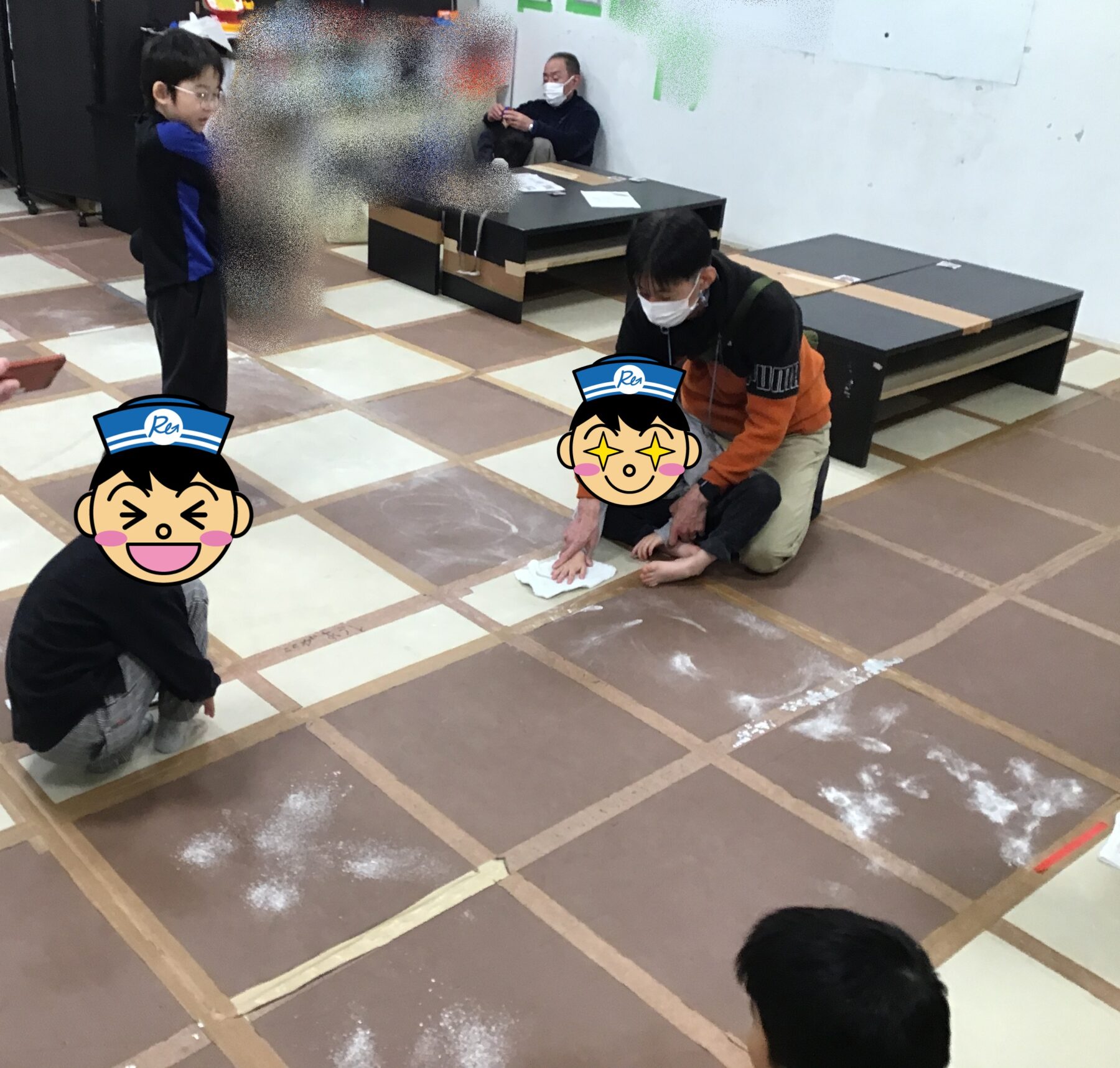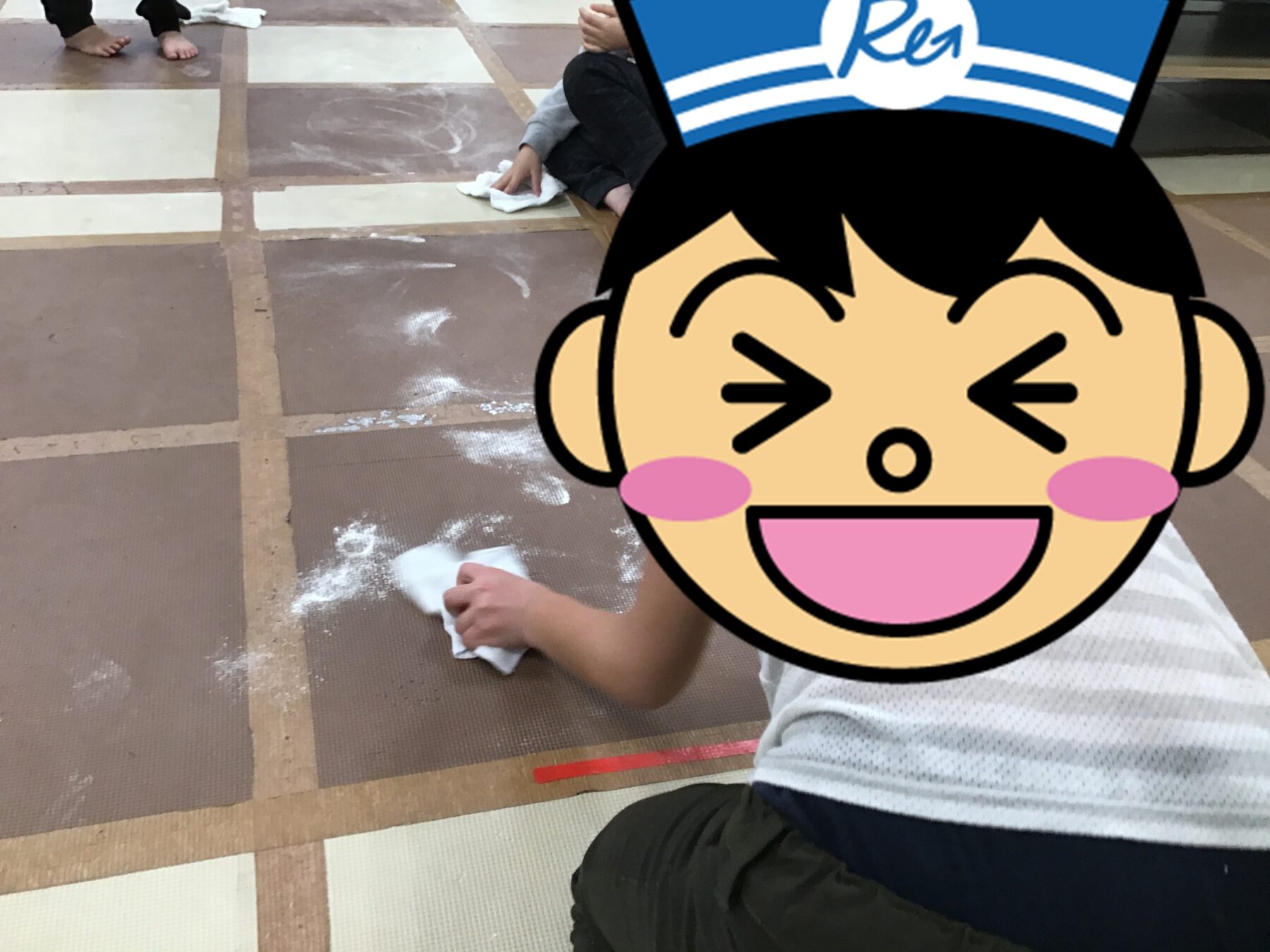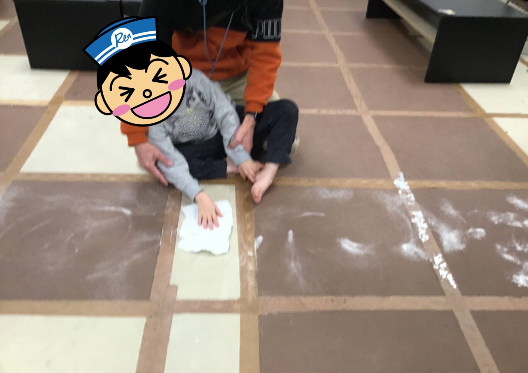 汚れをしっかり拭きとれるか小麦粉を床にまいて雑巾の使い方、手の動かし方を遊びながら学びました!