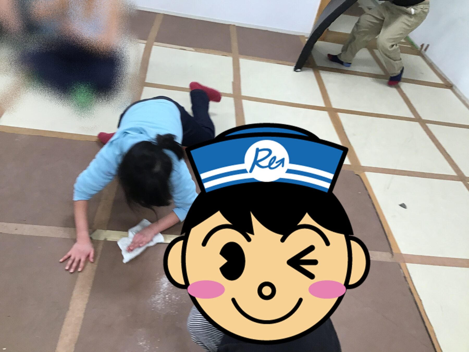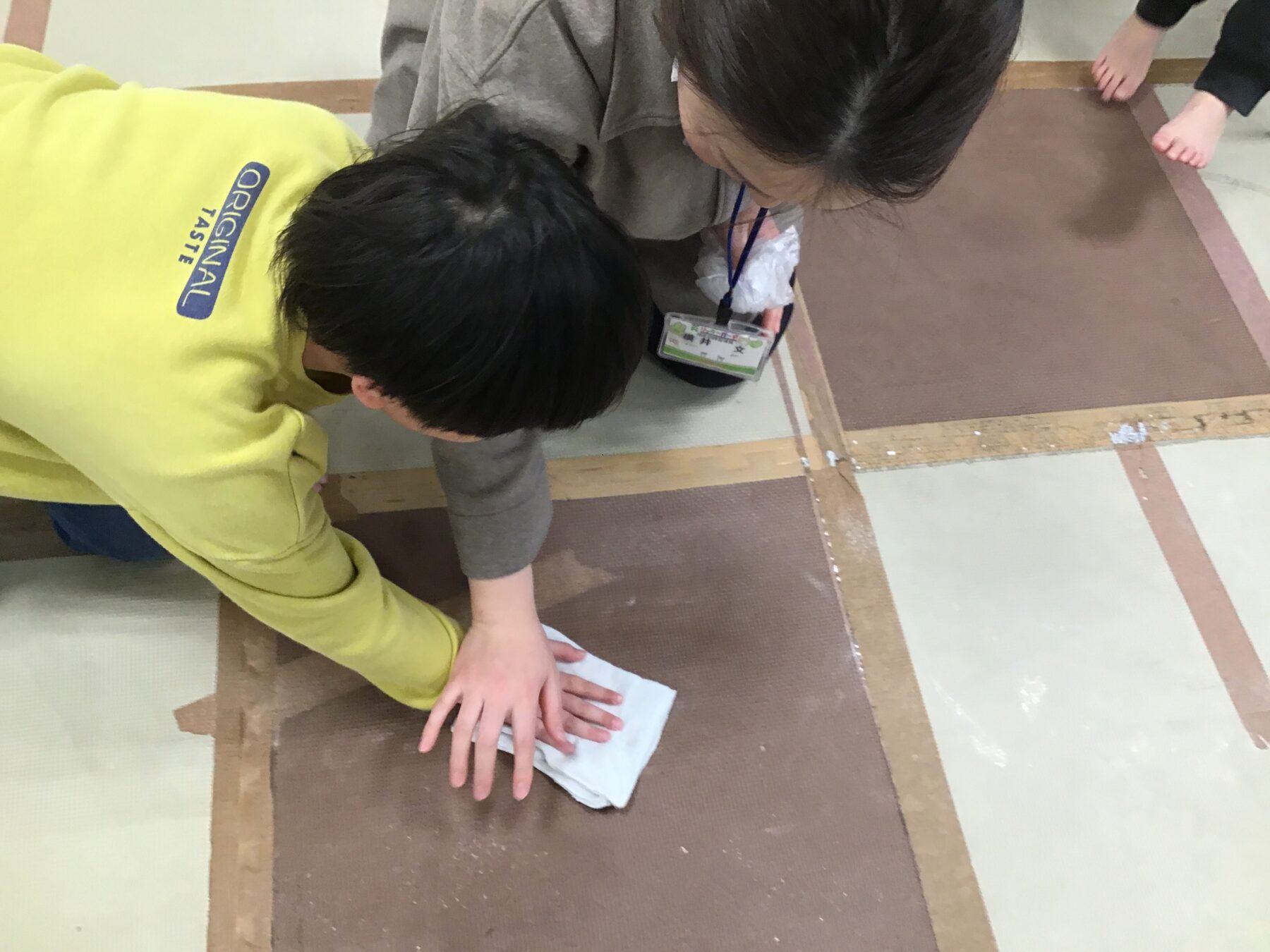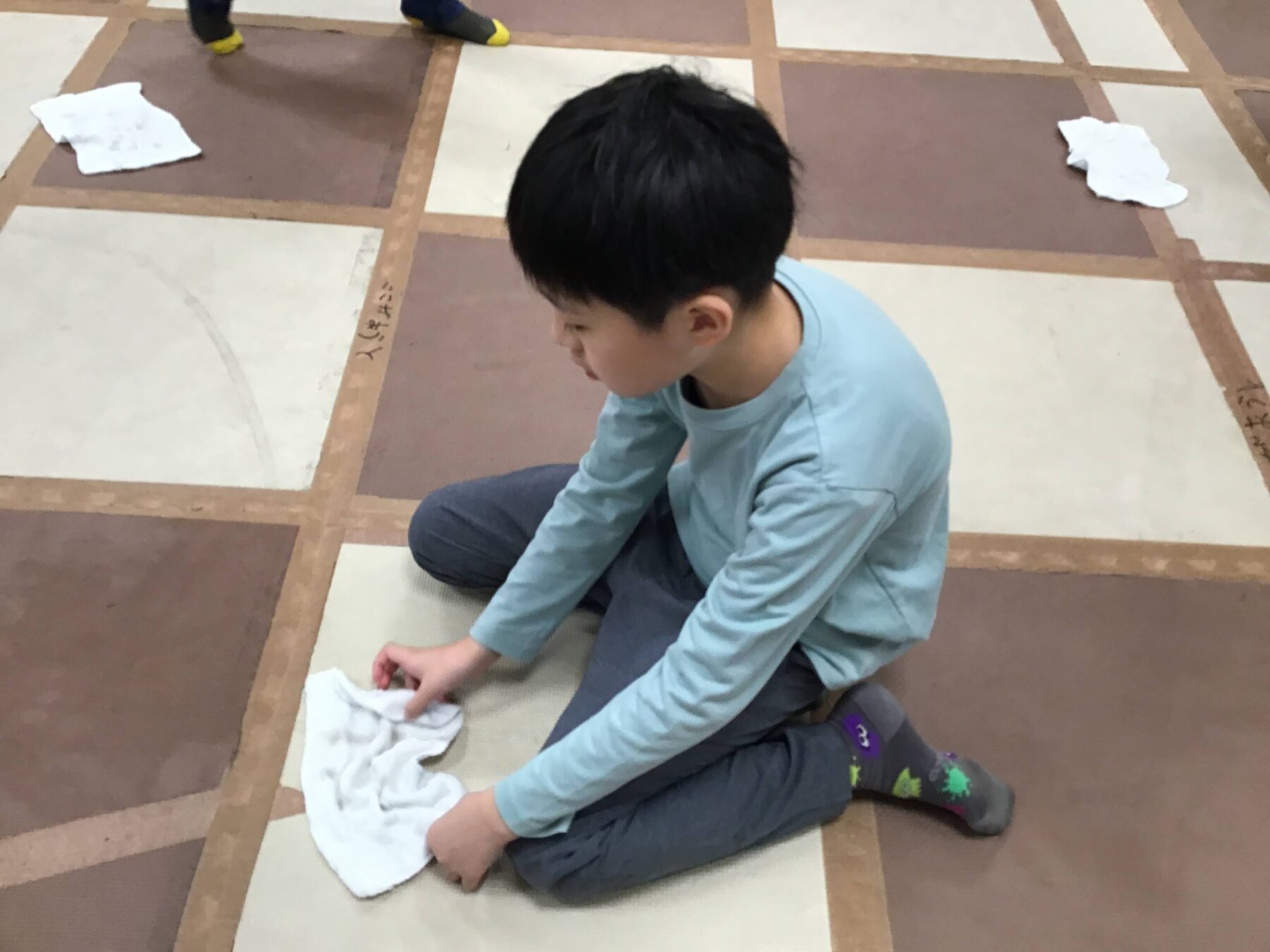 汚れをしっかり拭きとれるか小麦粉を床にまいて雑巾の使い方、手の動かし方を遊びながら学びました!