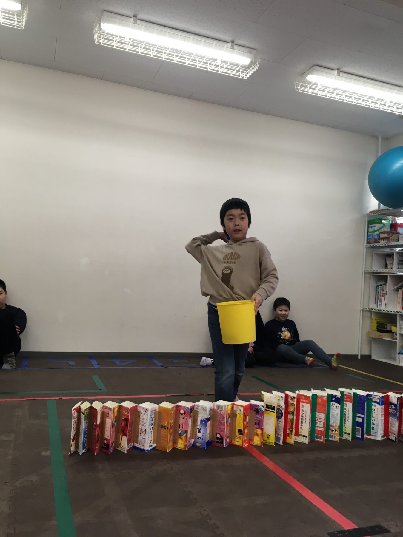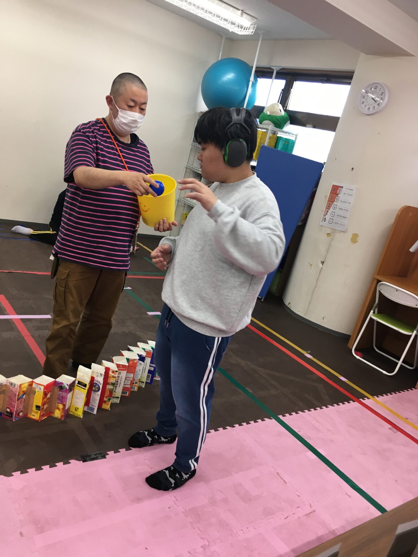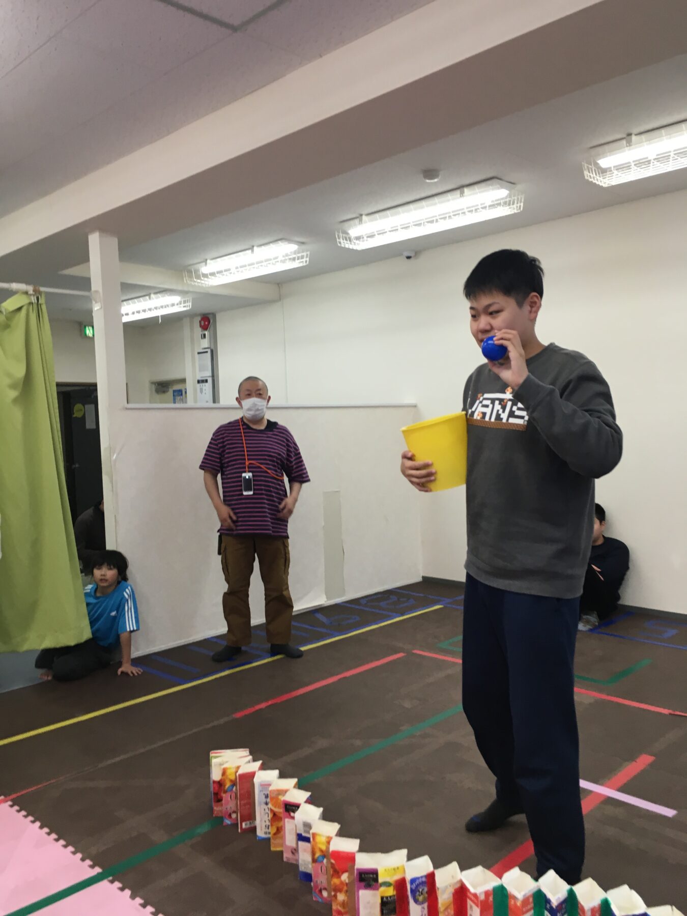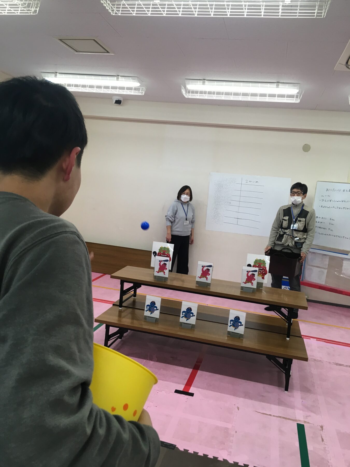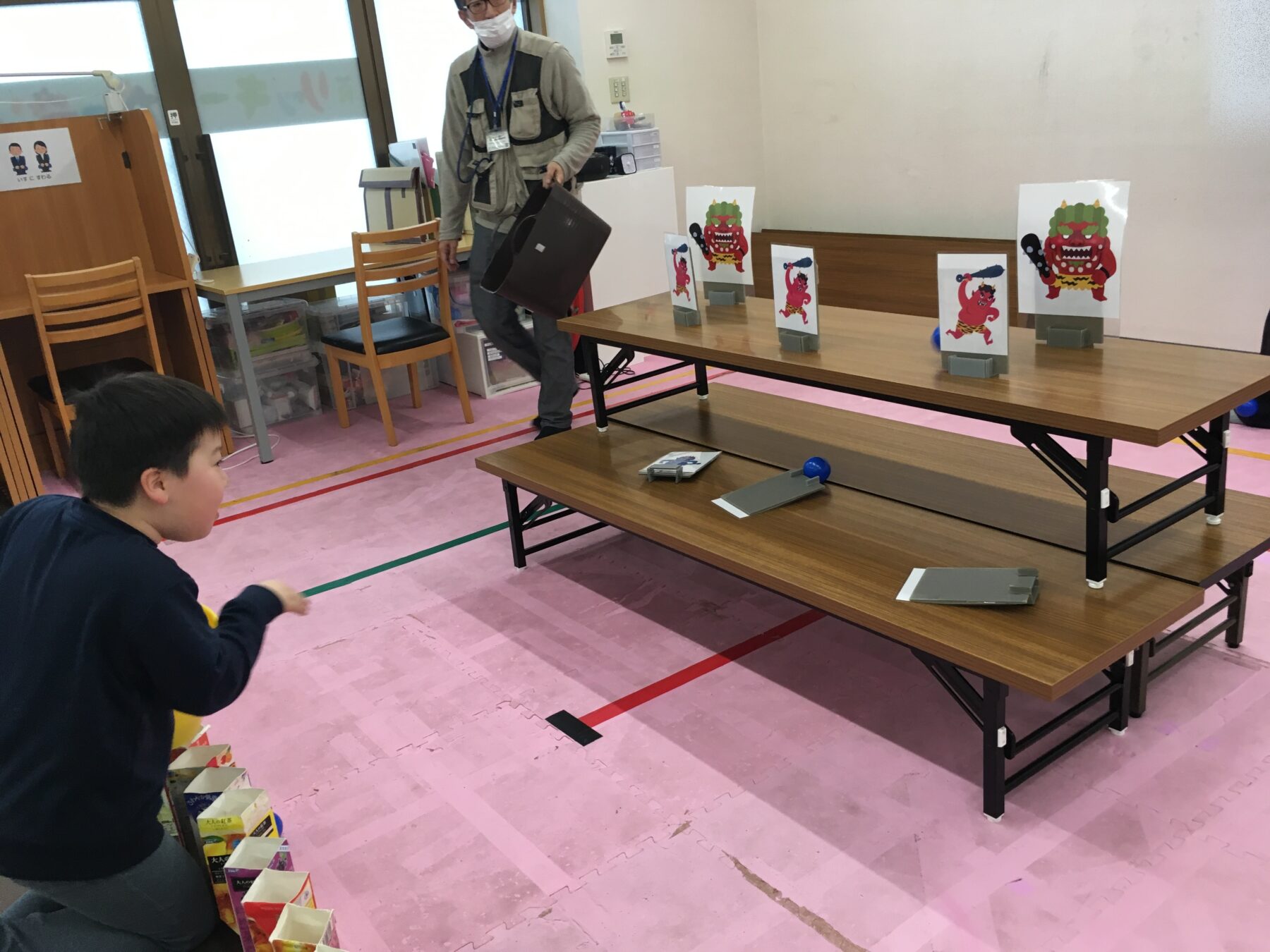 本日の活動は、節分にちなんで豆に見立てたボールを鬼の的めがけて投げて鬼退治をしました。