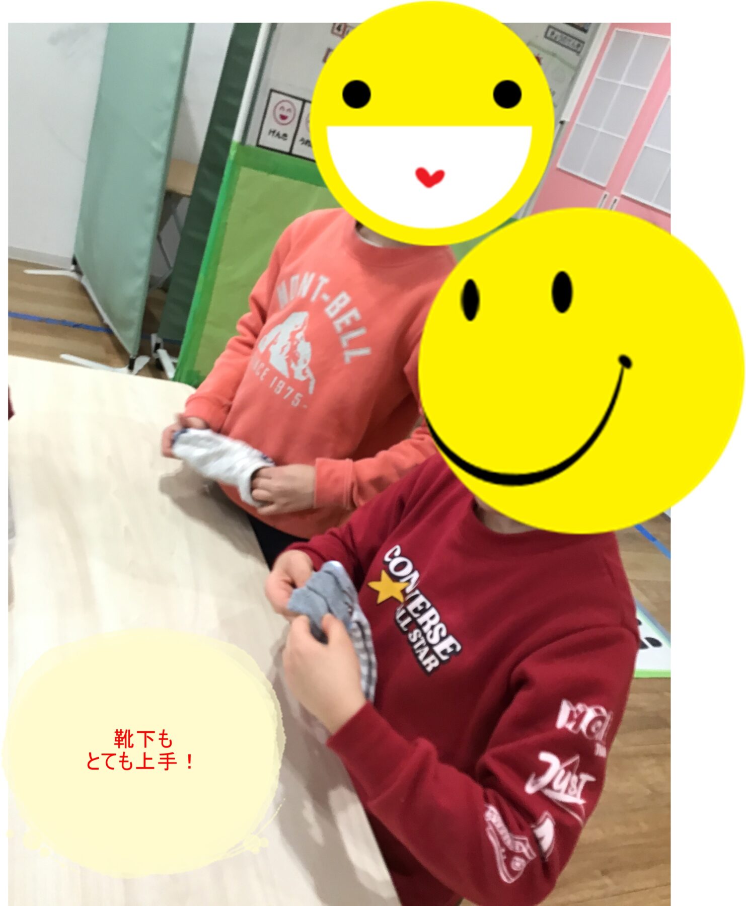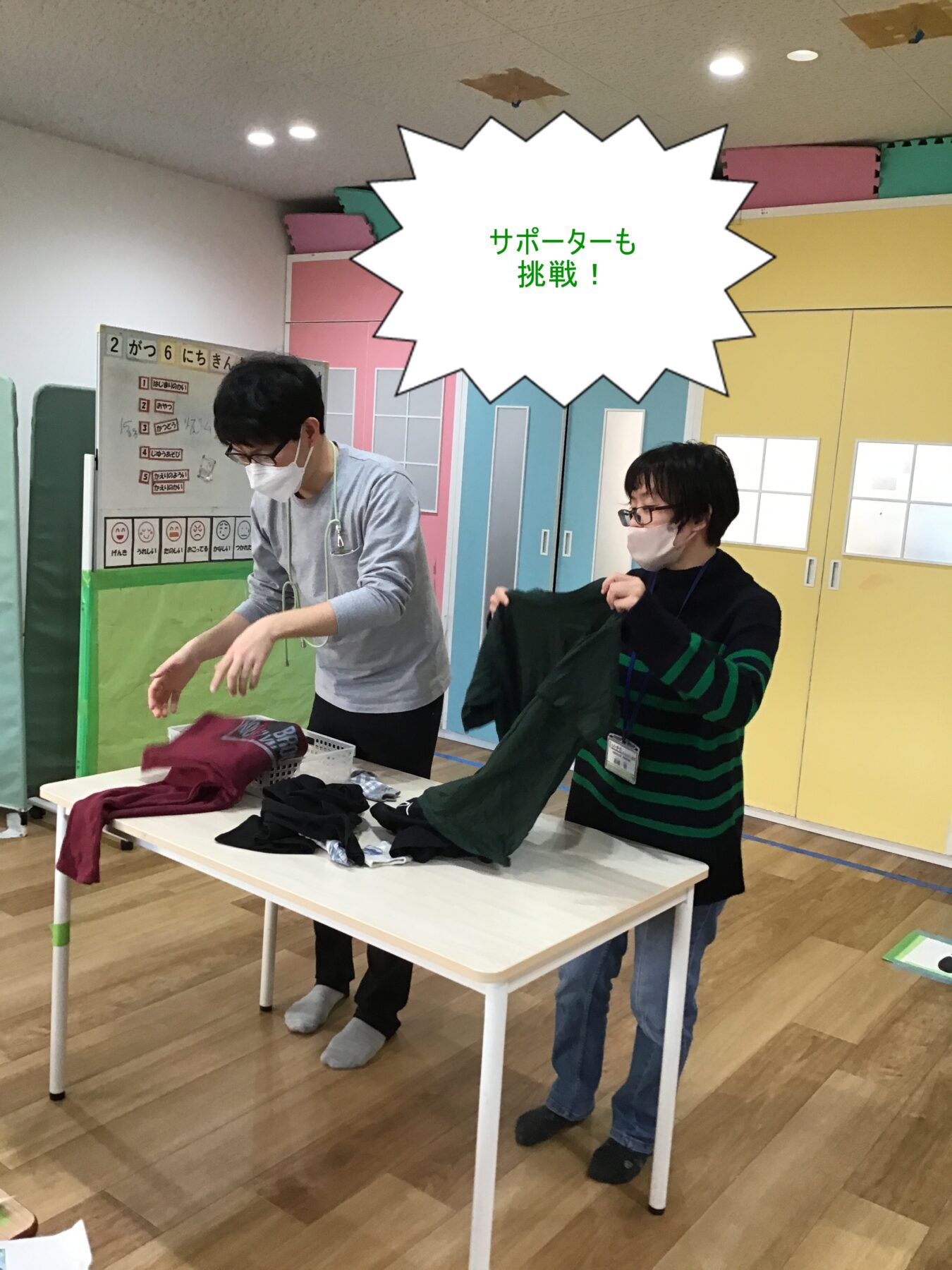 お友だち同士、協力して、靴下やTシャツなどをたたんでいただきました!