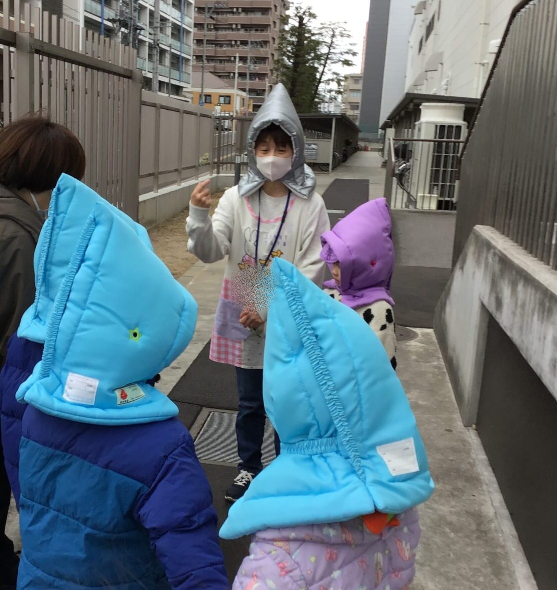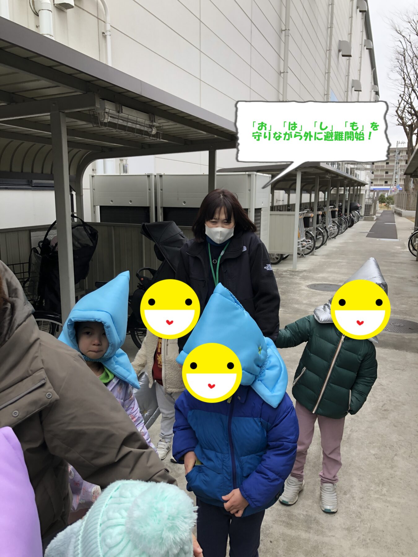 防災頭巾をかぶって駐車場まで避難する練習をしました。