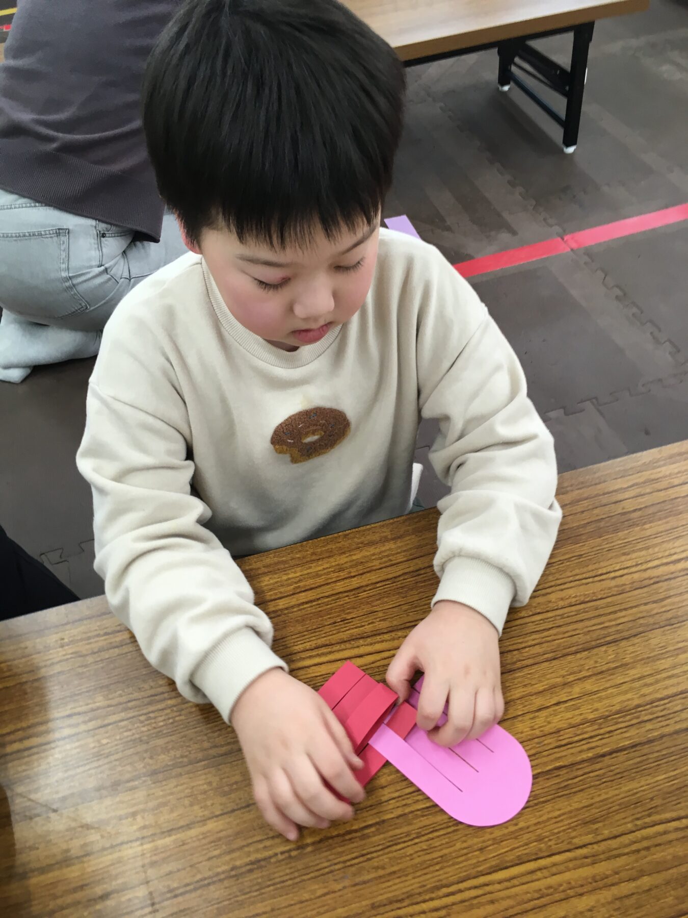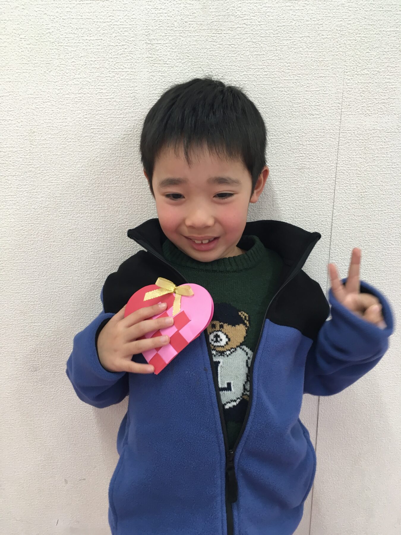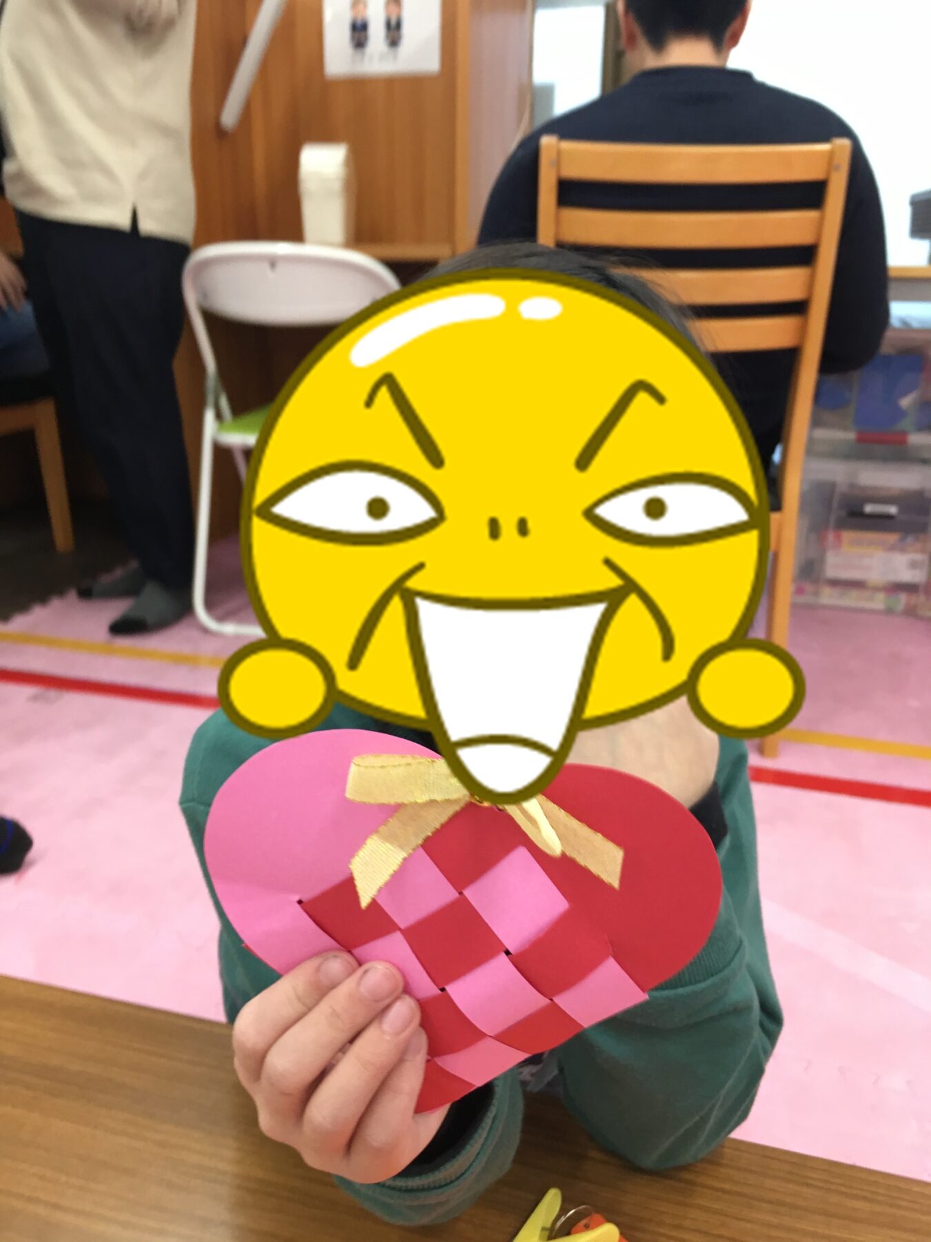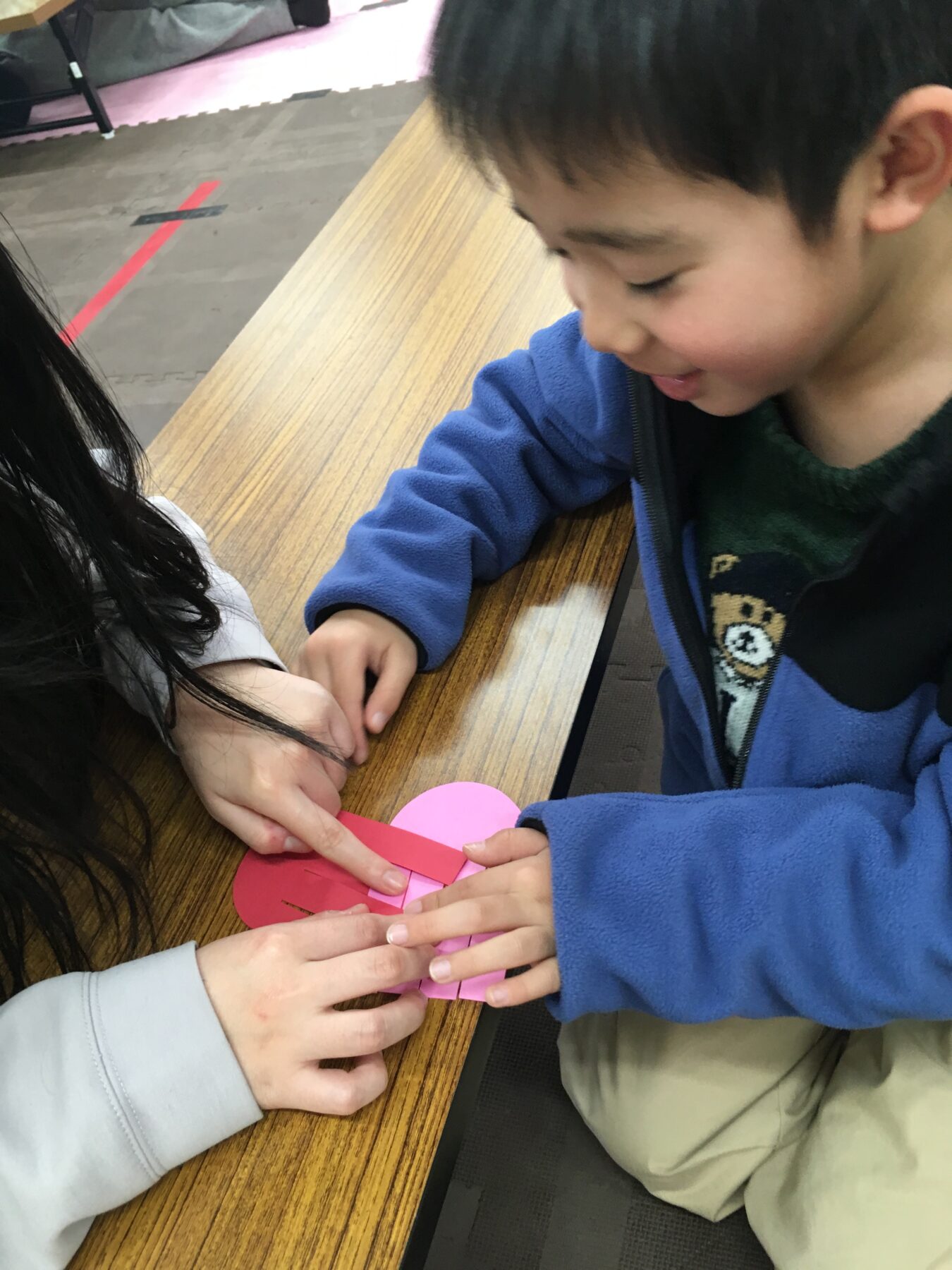 「バレンタインデーも近いので、おうちの方に日ごろの感謝を込めて、画用紙で作ったハート形のバッグにチョコレートを入れてプレゼントをしよう!」ということで、ハート形のバッグ制作をしました。
