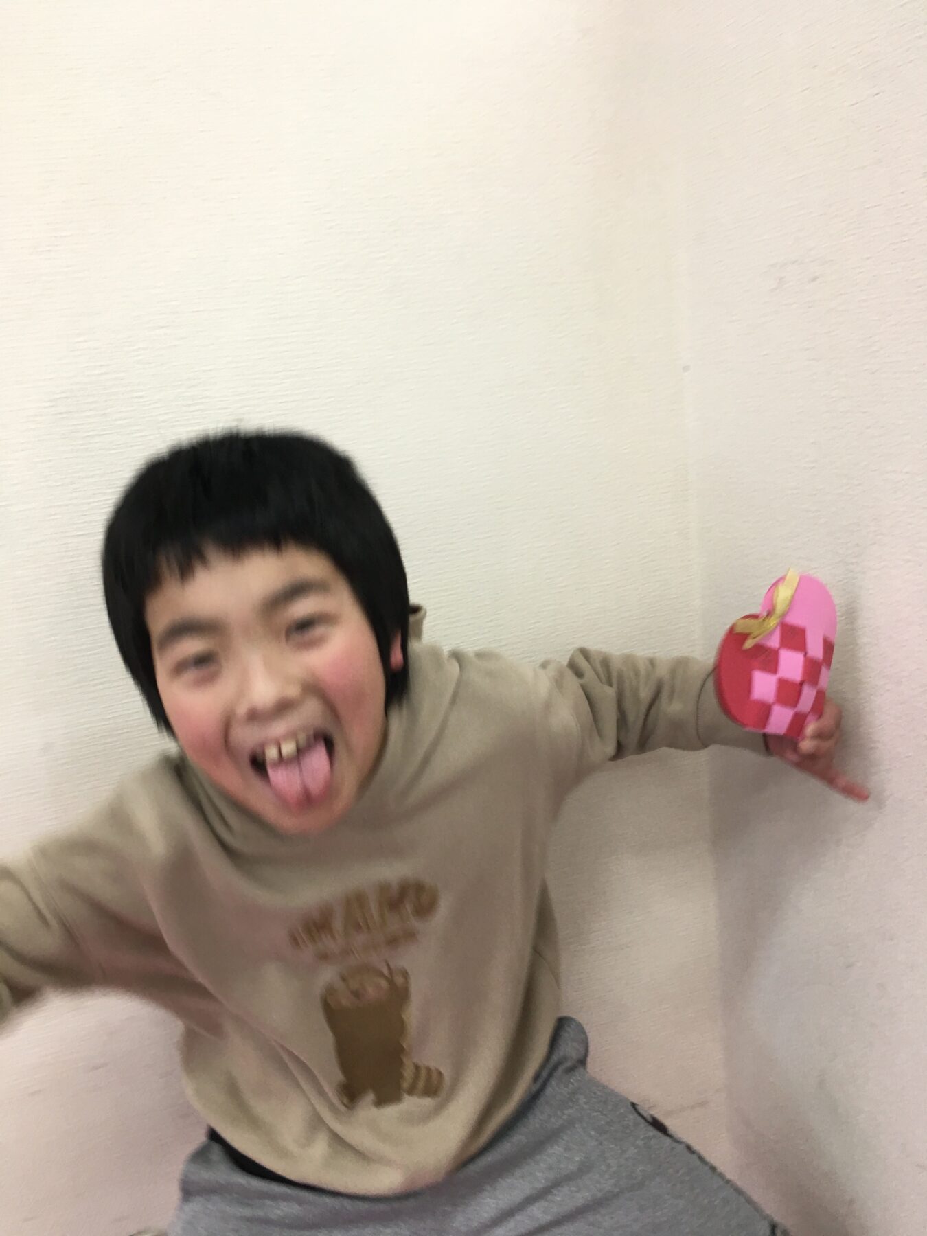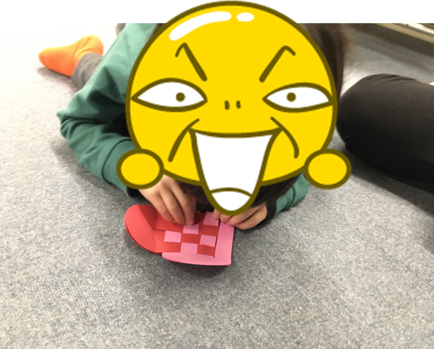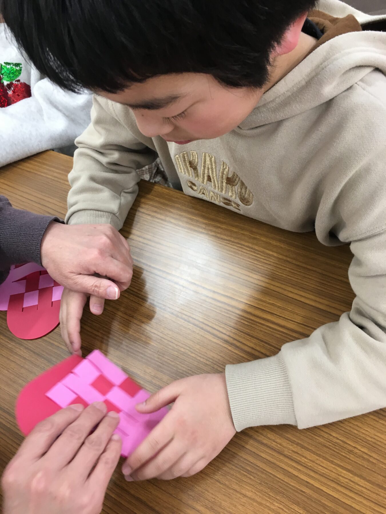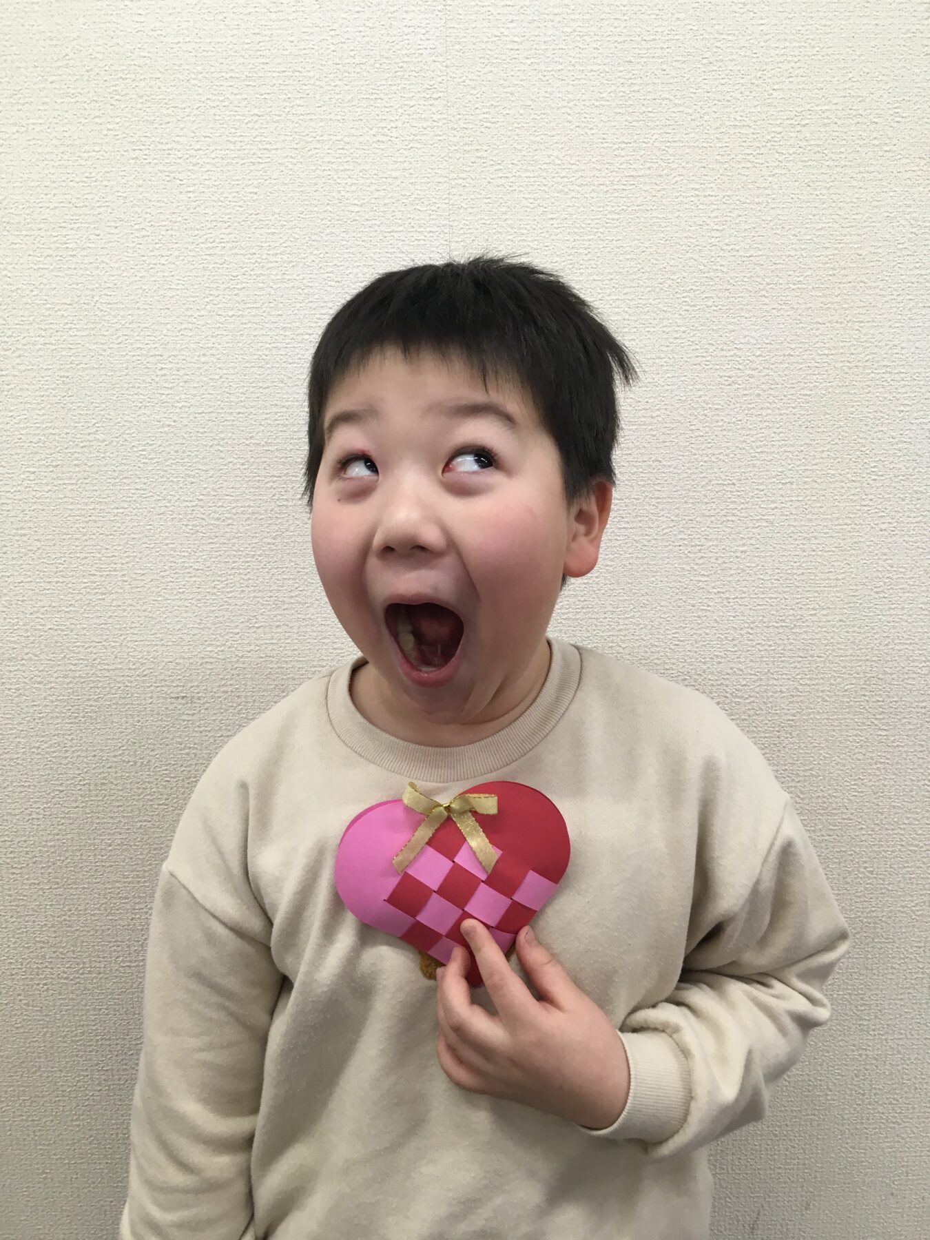 「バレンタインデーも近いので、おうちの方に日ごろの感謝を込めて、画用紙で作ったハート形のバッグにチョコレートを入れてプレゼントをしよう!」ということで、ハート形のバッグ制作をしました。