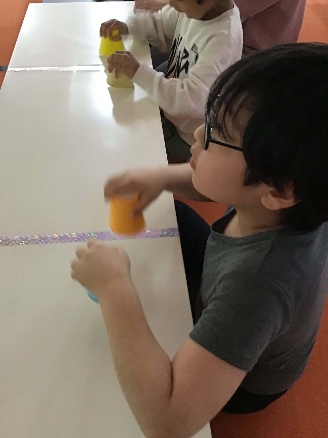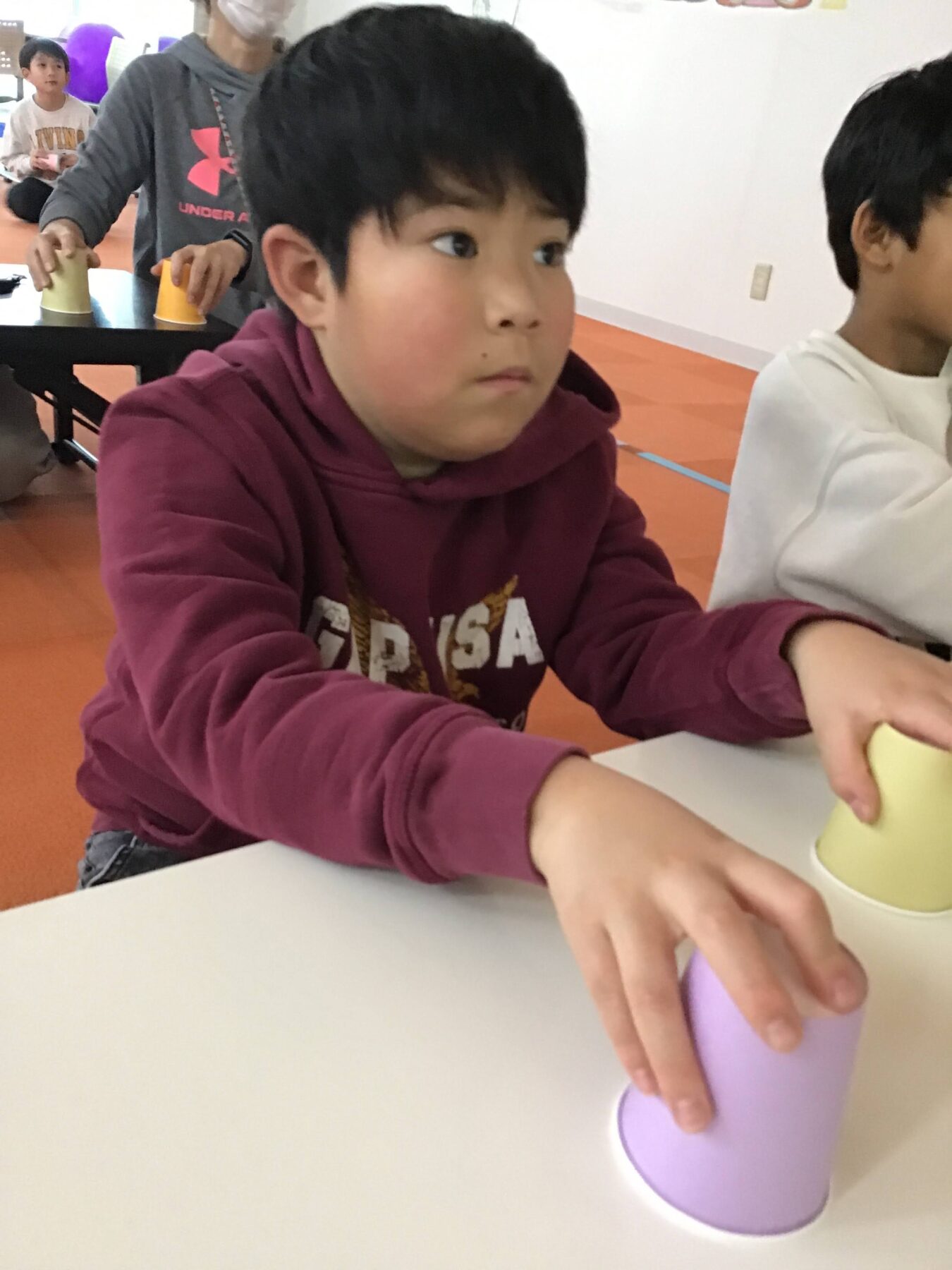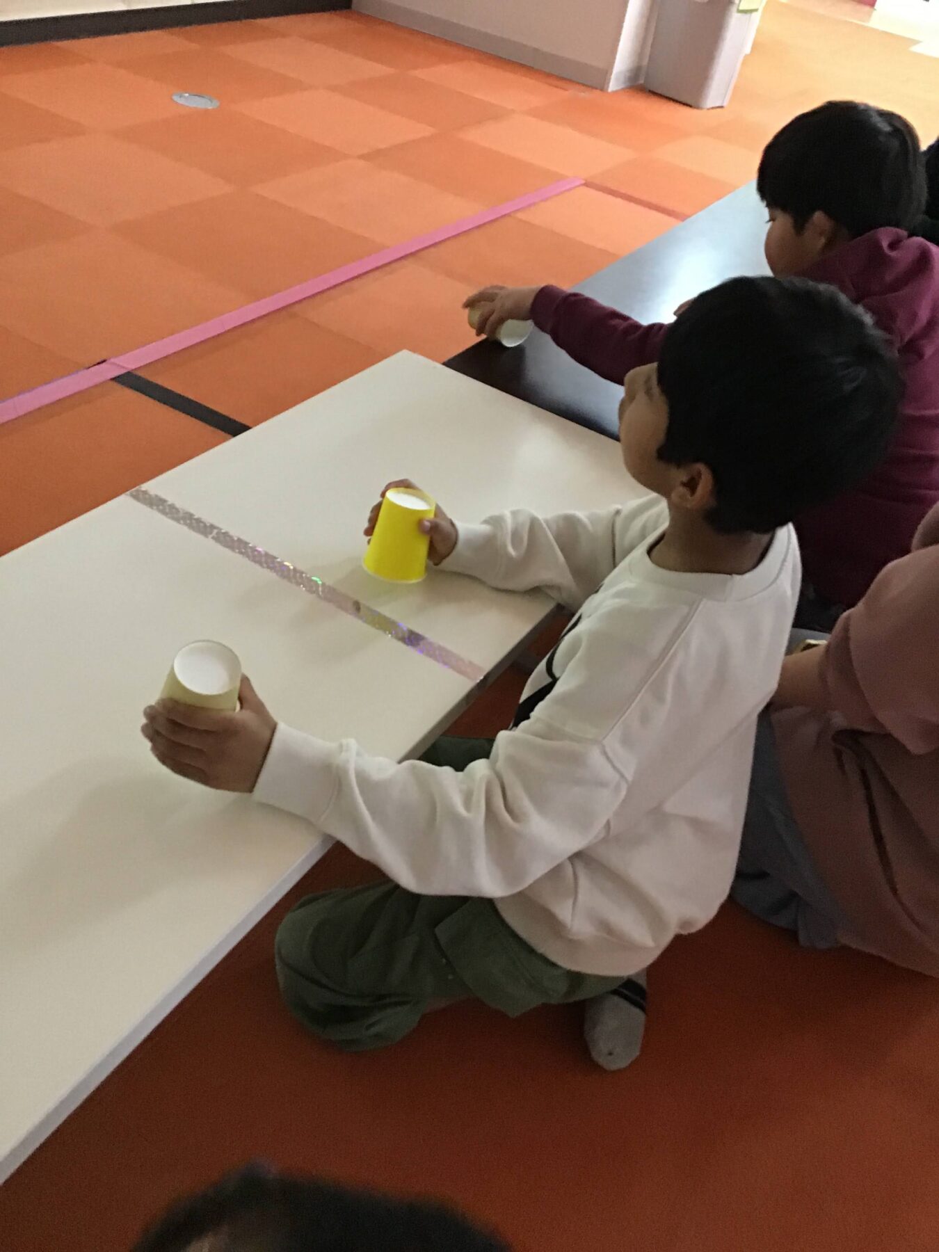 動画に合わせて、紙コップをテーブルに置いたときの音、紙コップ同士を合わせて出す音を楽しみながら演奏しました。