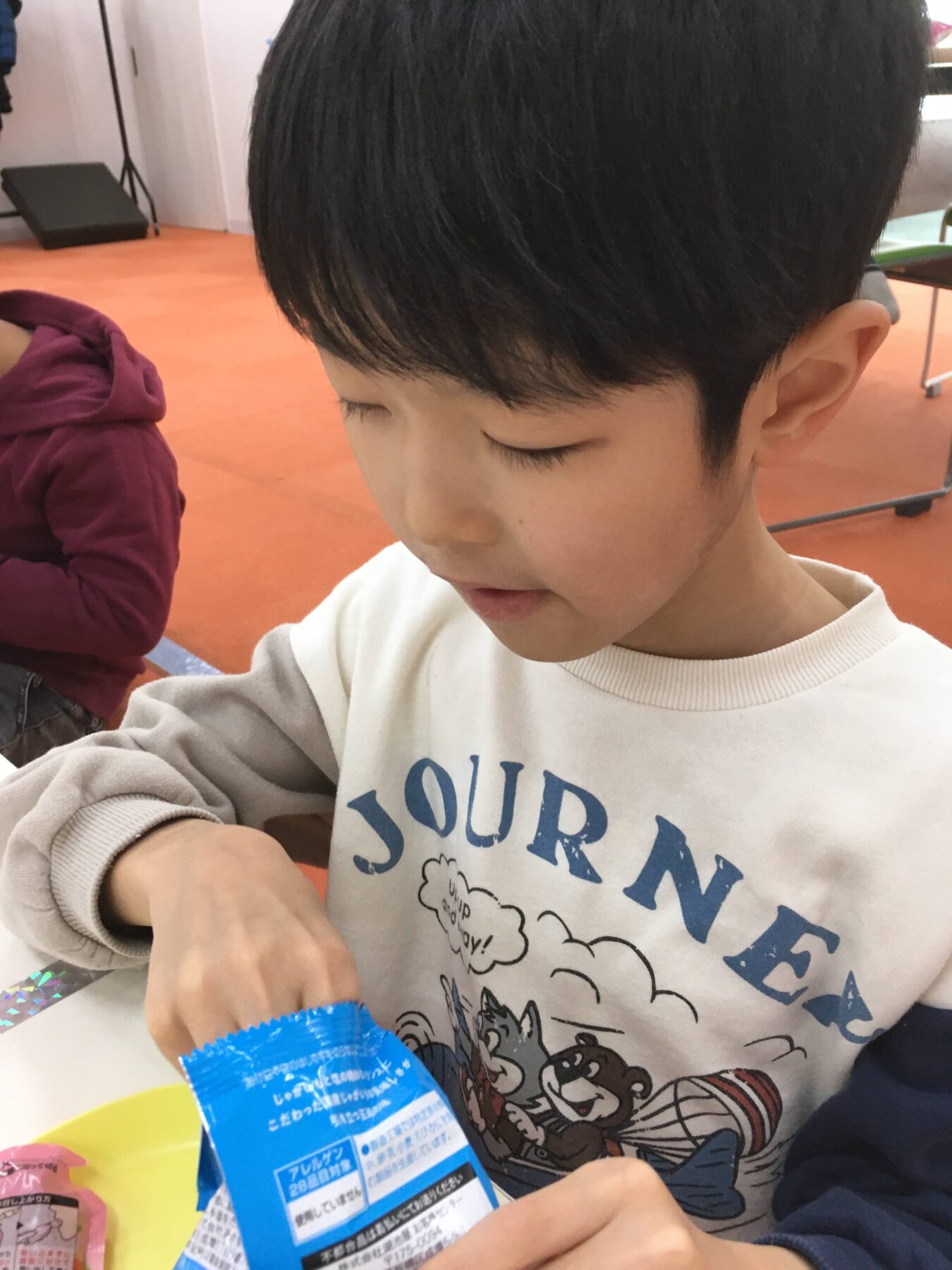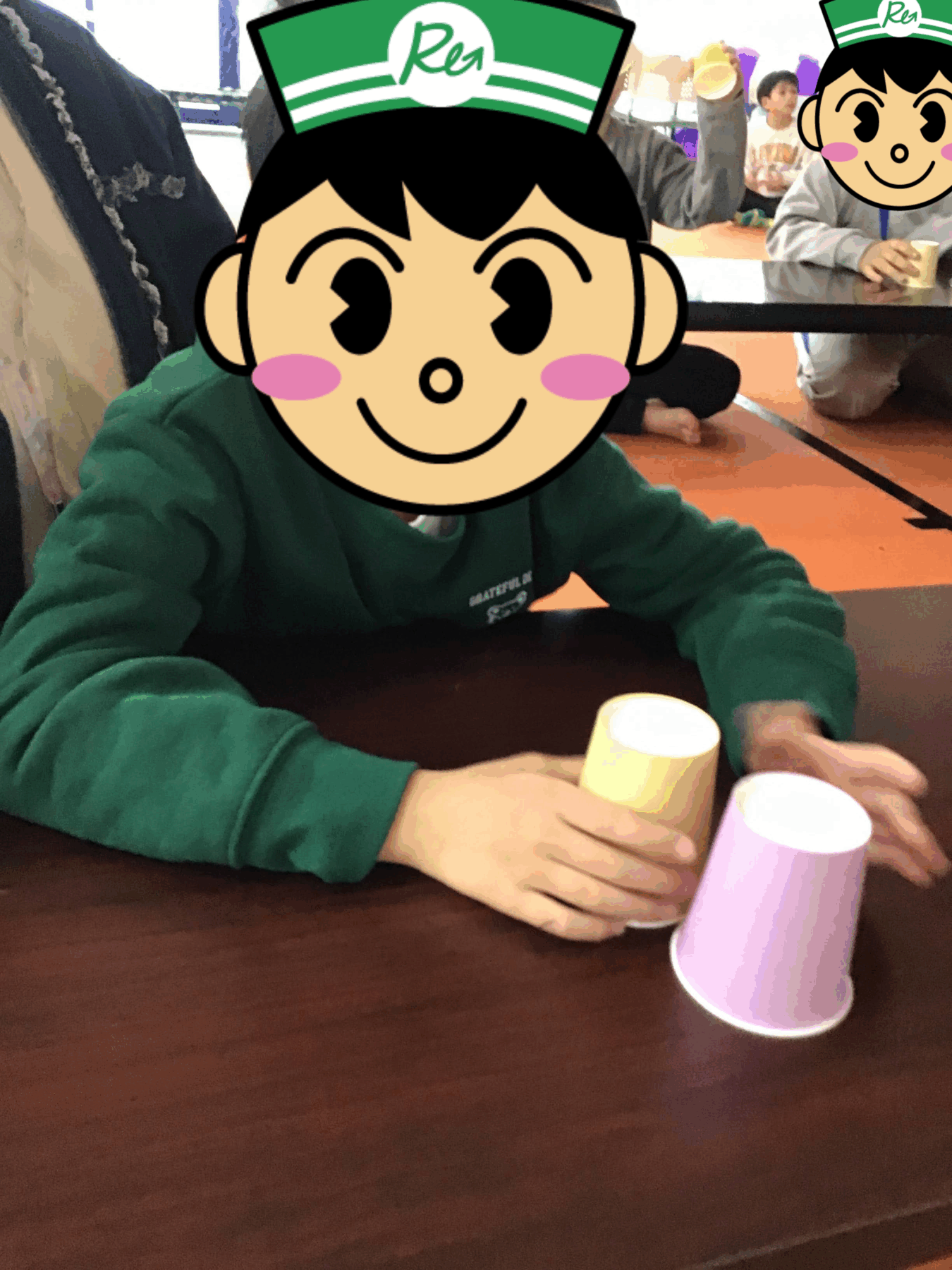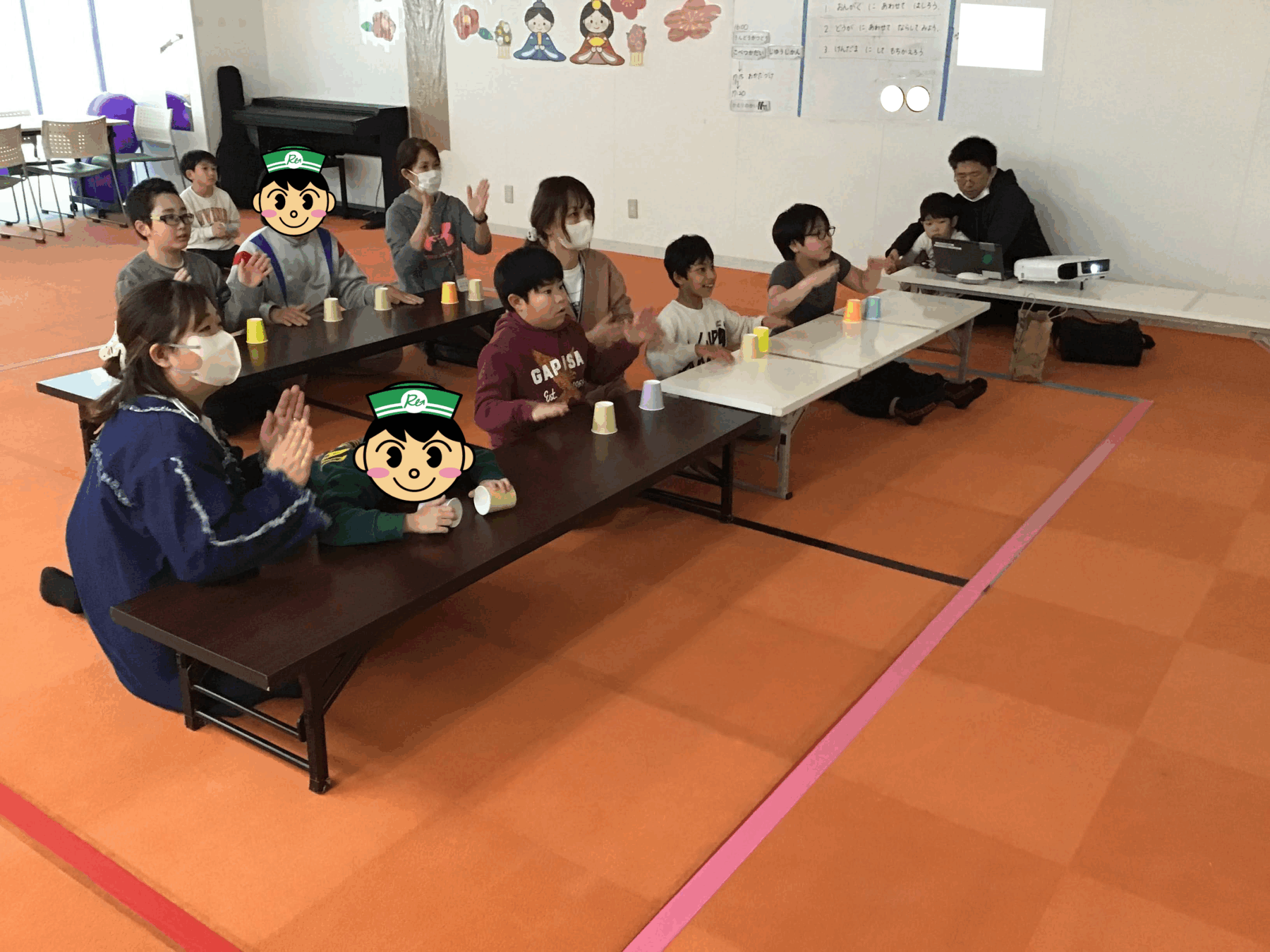 動画に合わせて、紙コップをテーブルに置いたときの音、紙コップ同士を合わせて出す音を楽しみながら演奏しました。