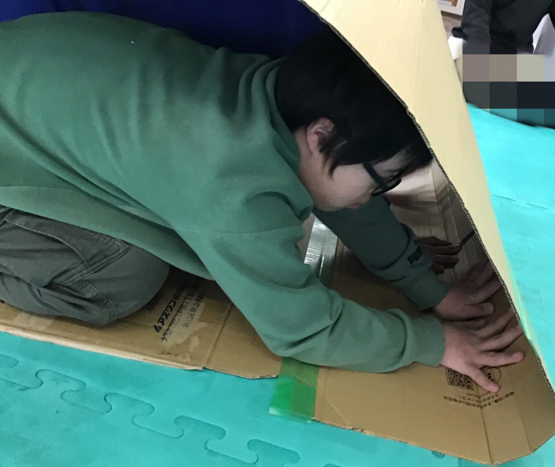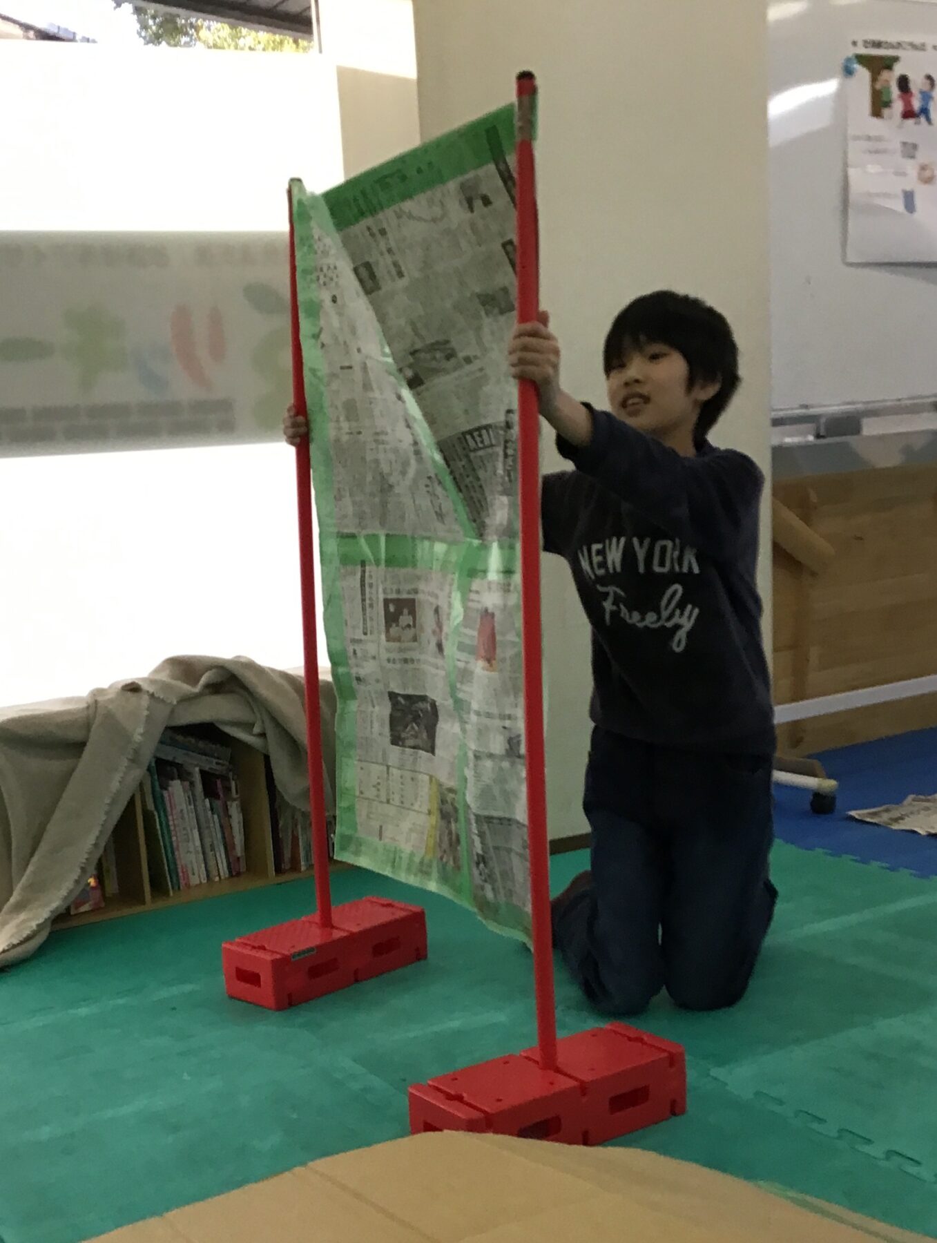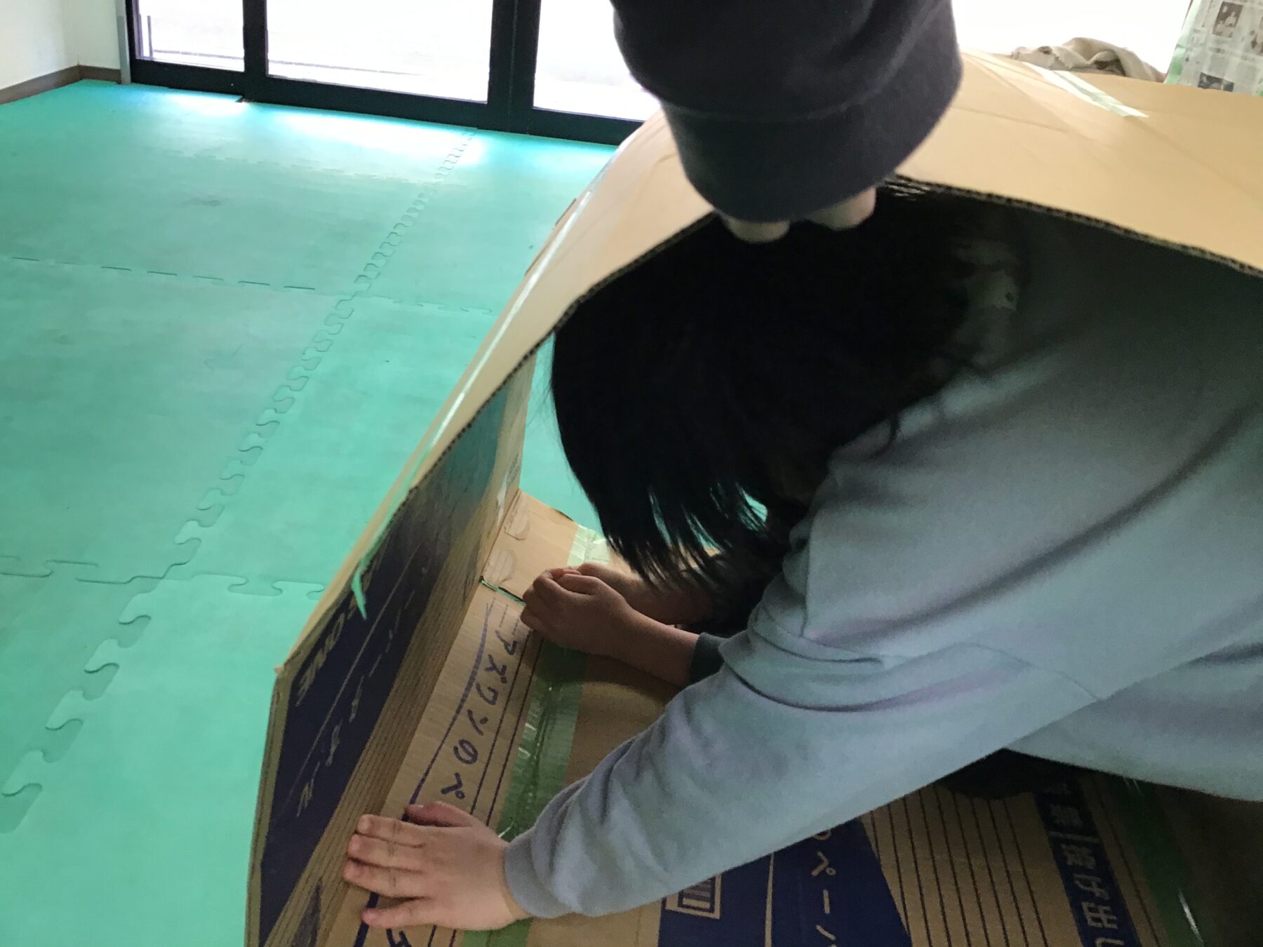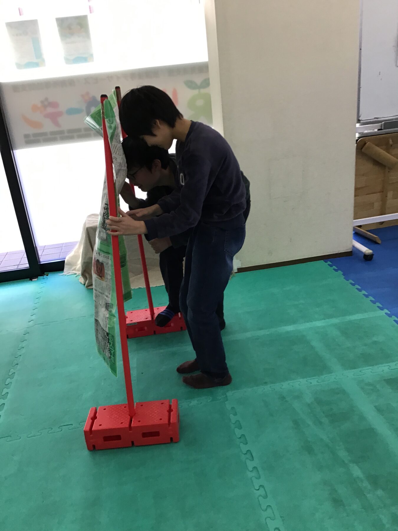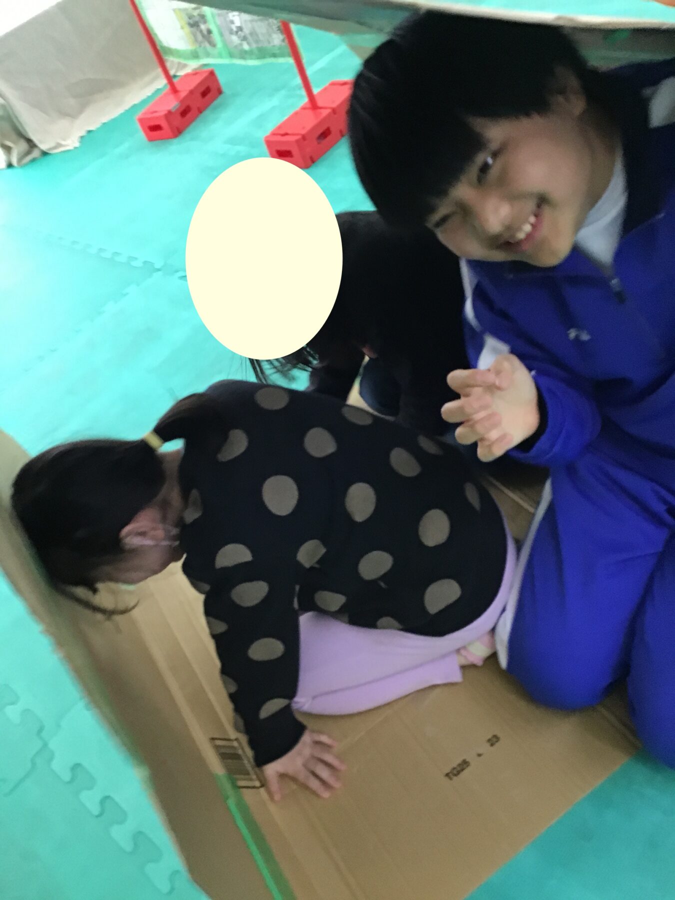 鬼役のサポーターにタッチするまでの間に、「新聞紙の下」「衝立の裏」「キャタピラーの中」のどれかを選び、かくれんぼしながらゴールを目指します。