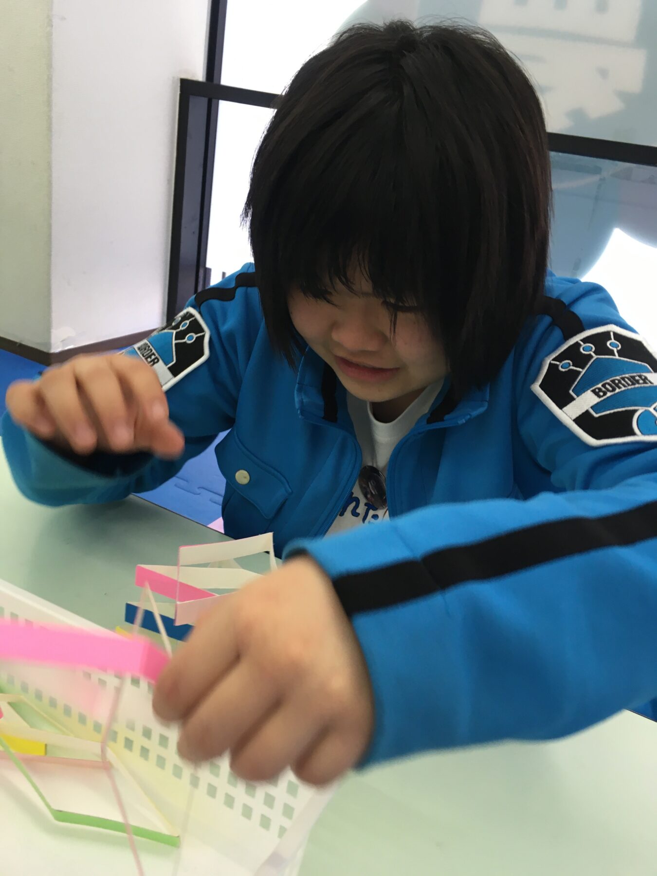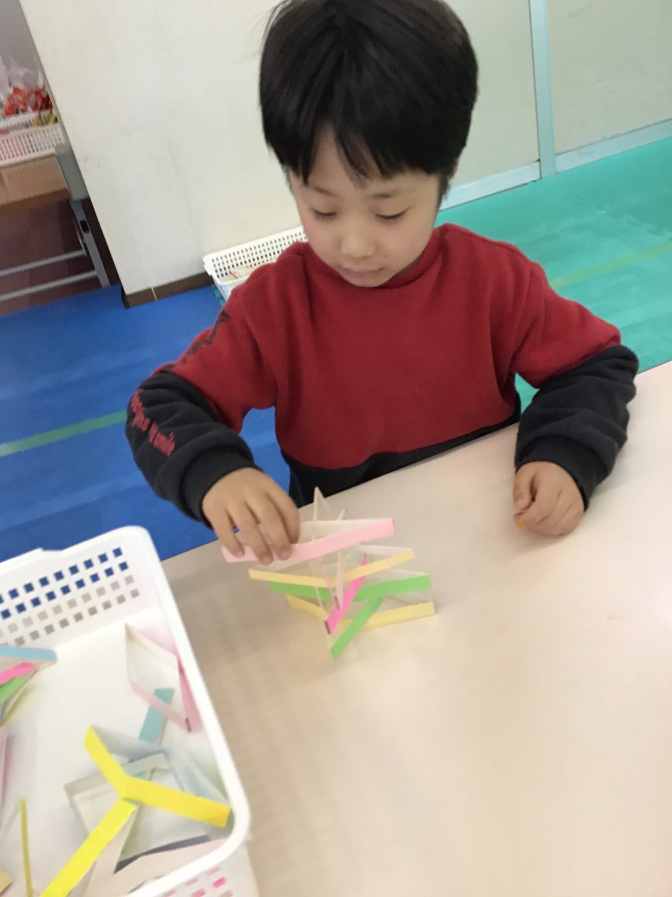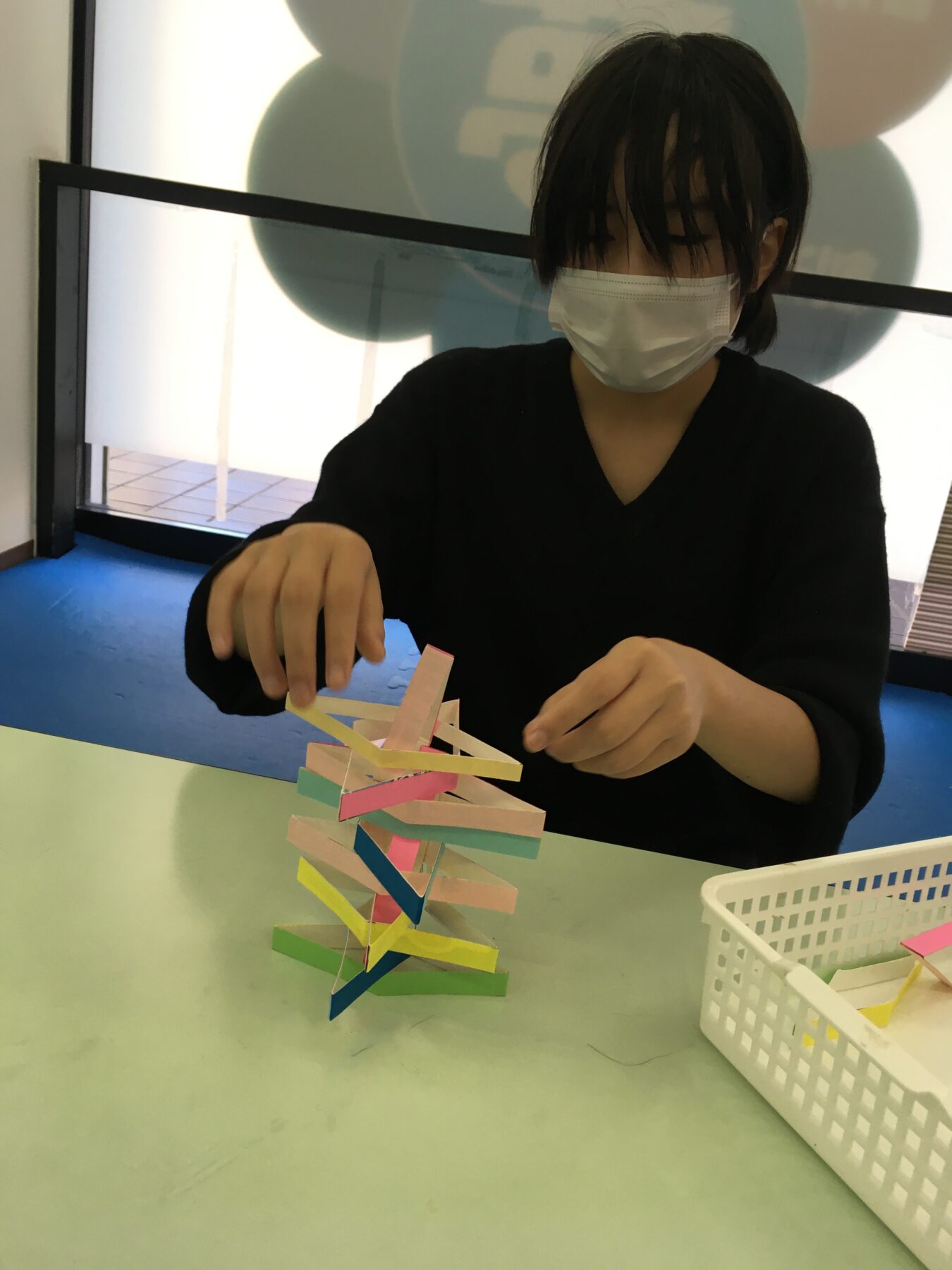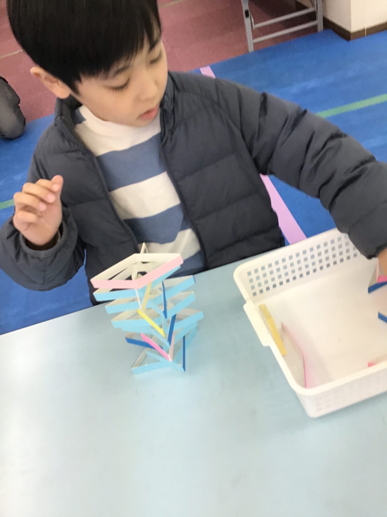 1分間、牛乳パックを細長くきったものを積み上げていくのですが、