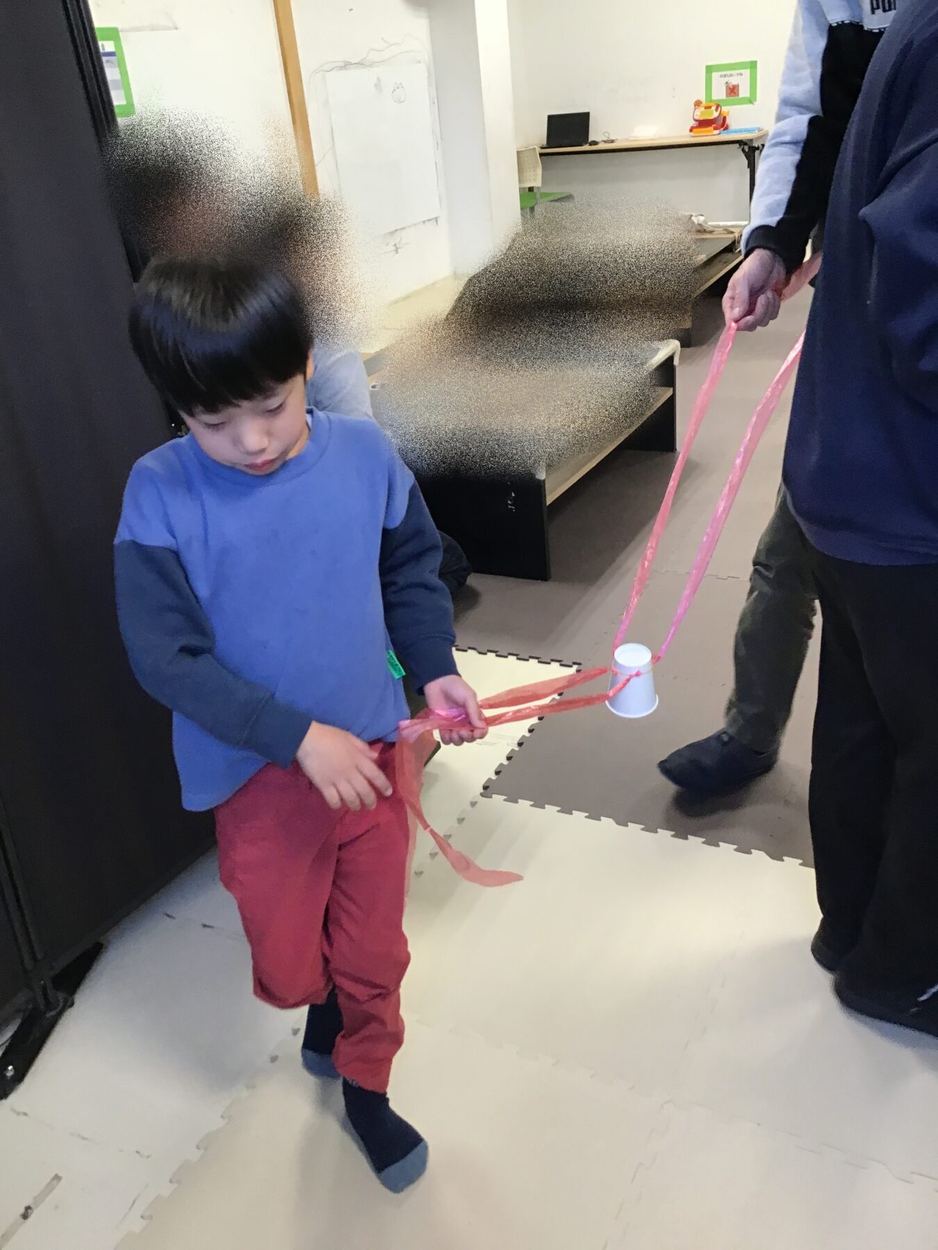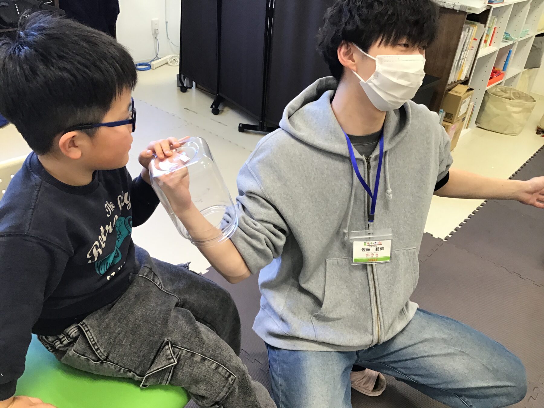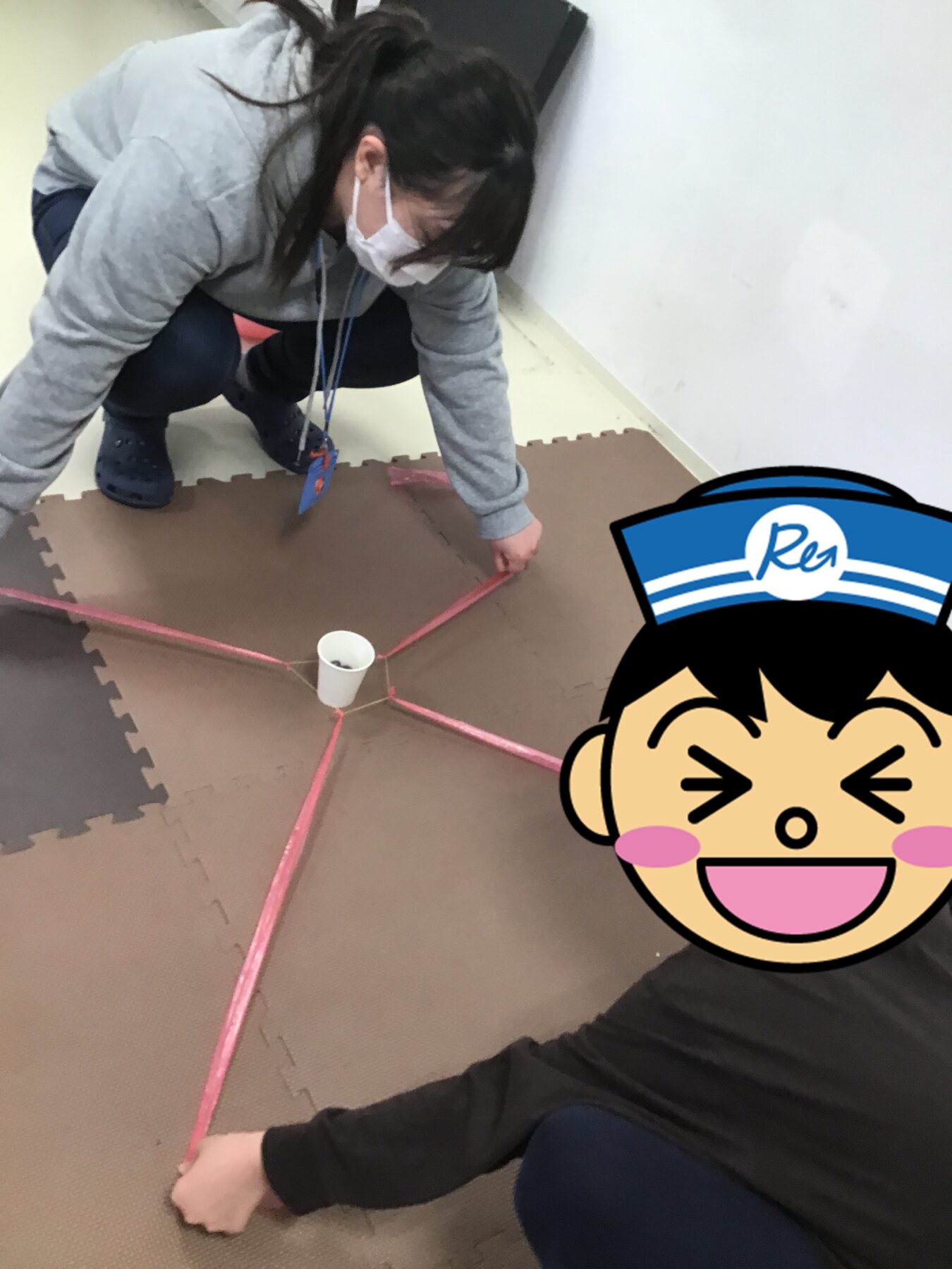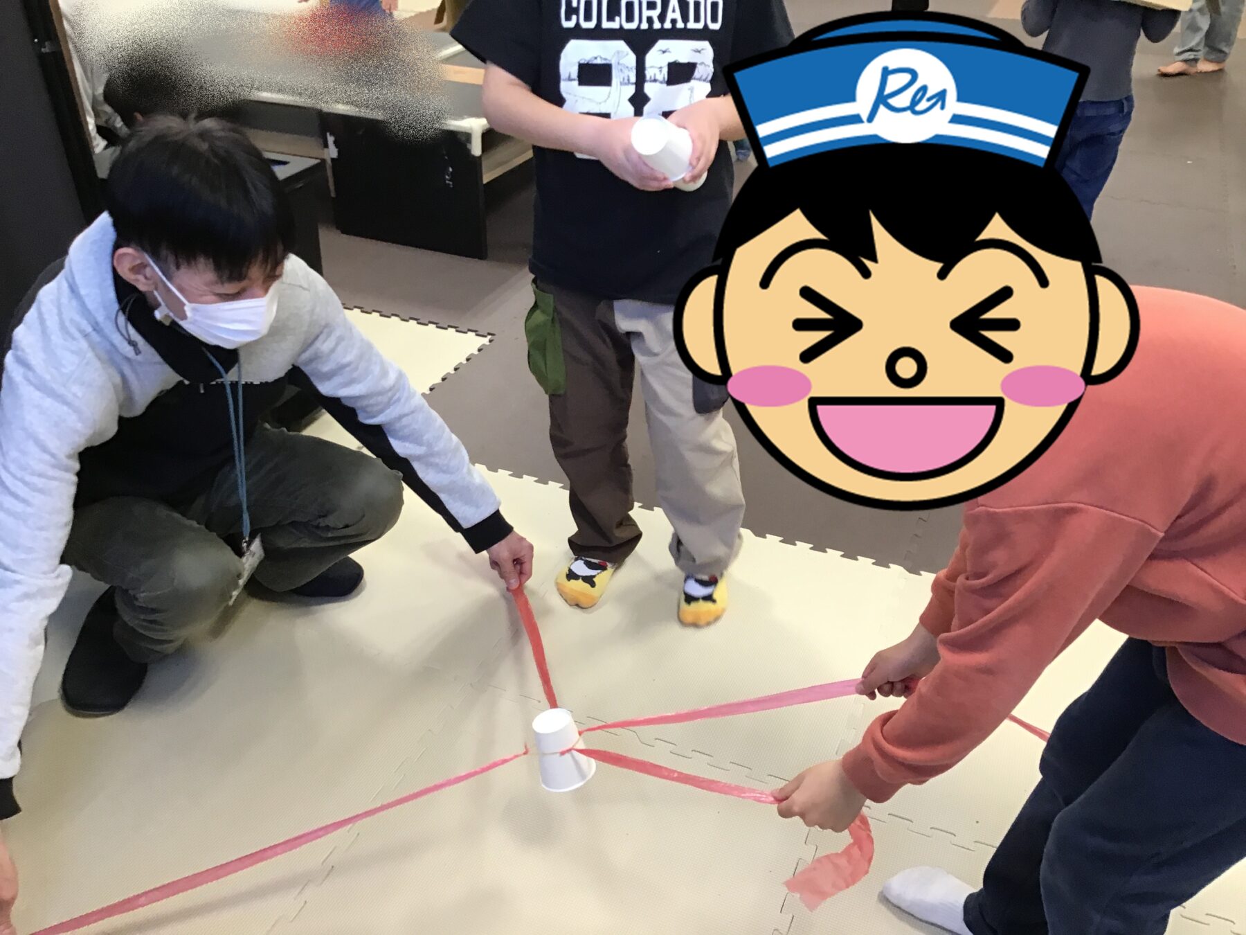 お友達と協力して紙コップを掴んで運びました!