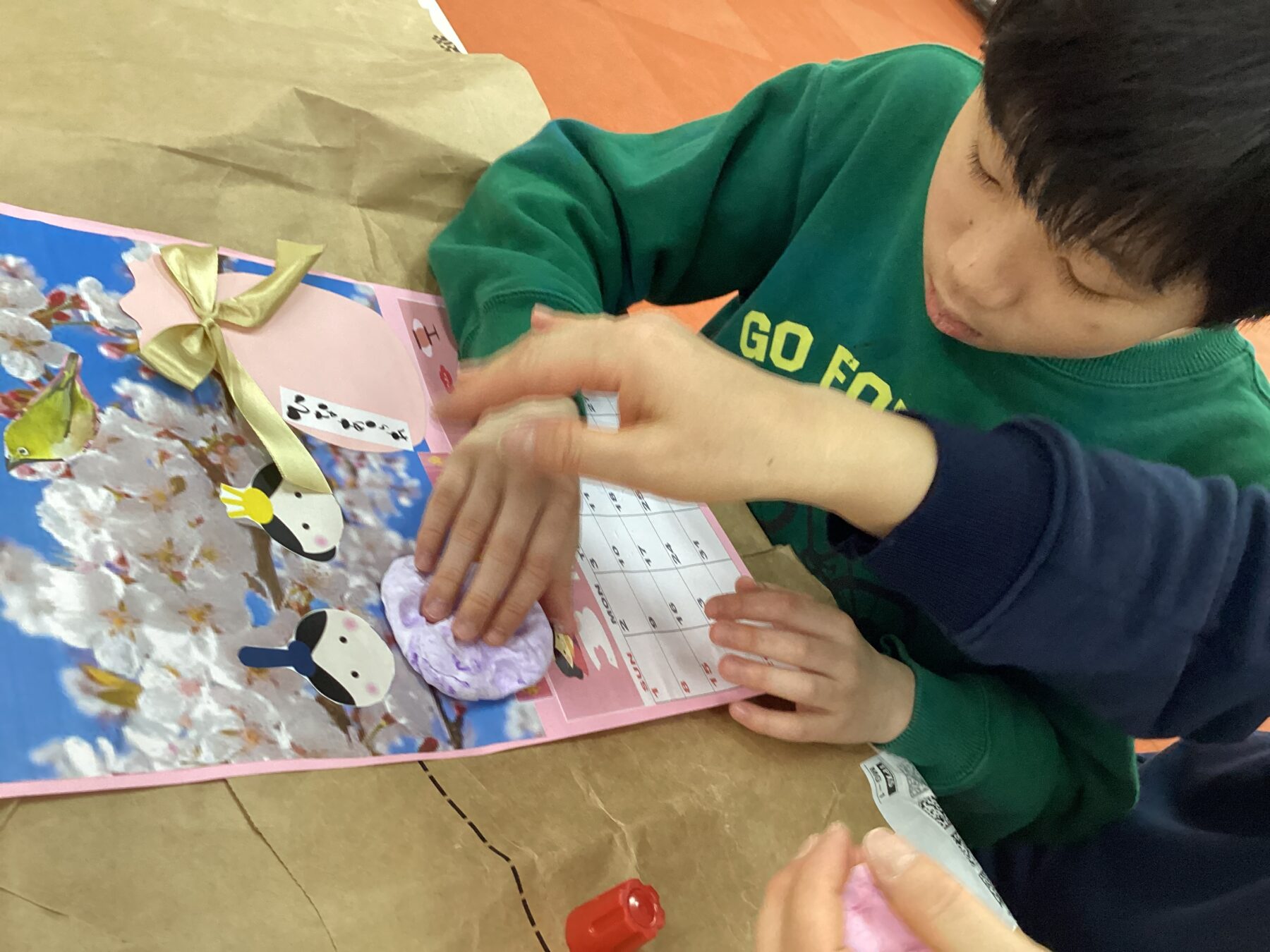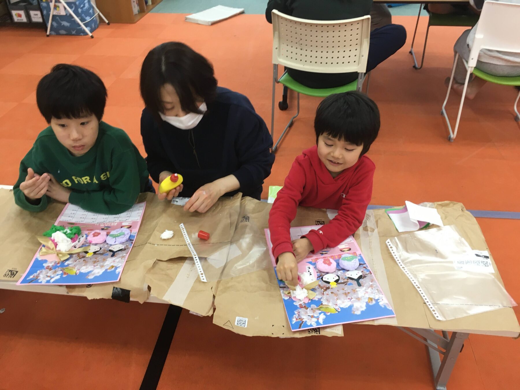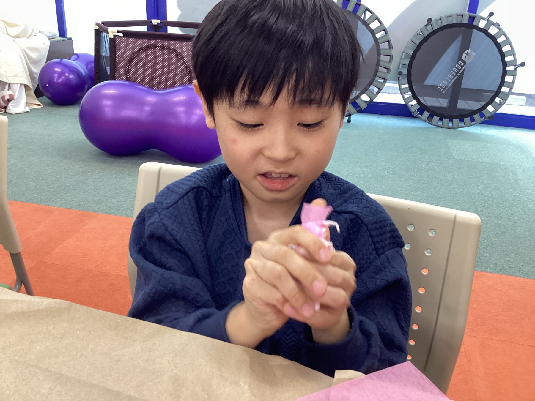 紙粘土にお花紙で色を付けたり、ひなあられに見立てて、緑、白、ピンクのお花紙を丸め貼る作業をしました!