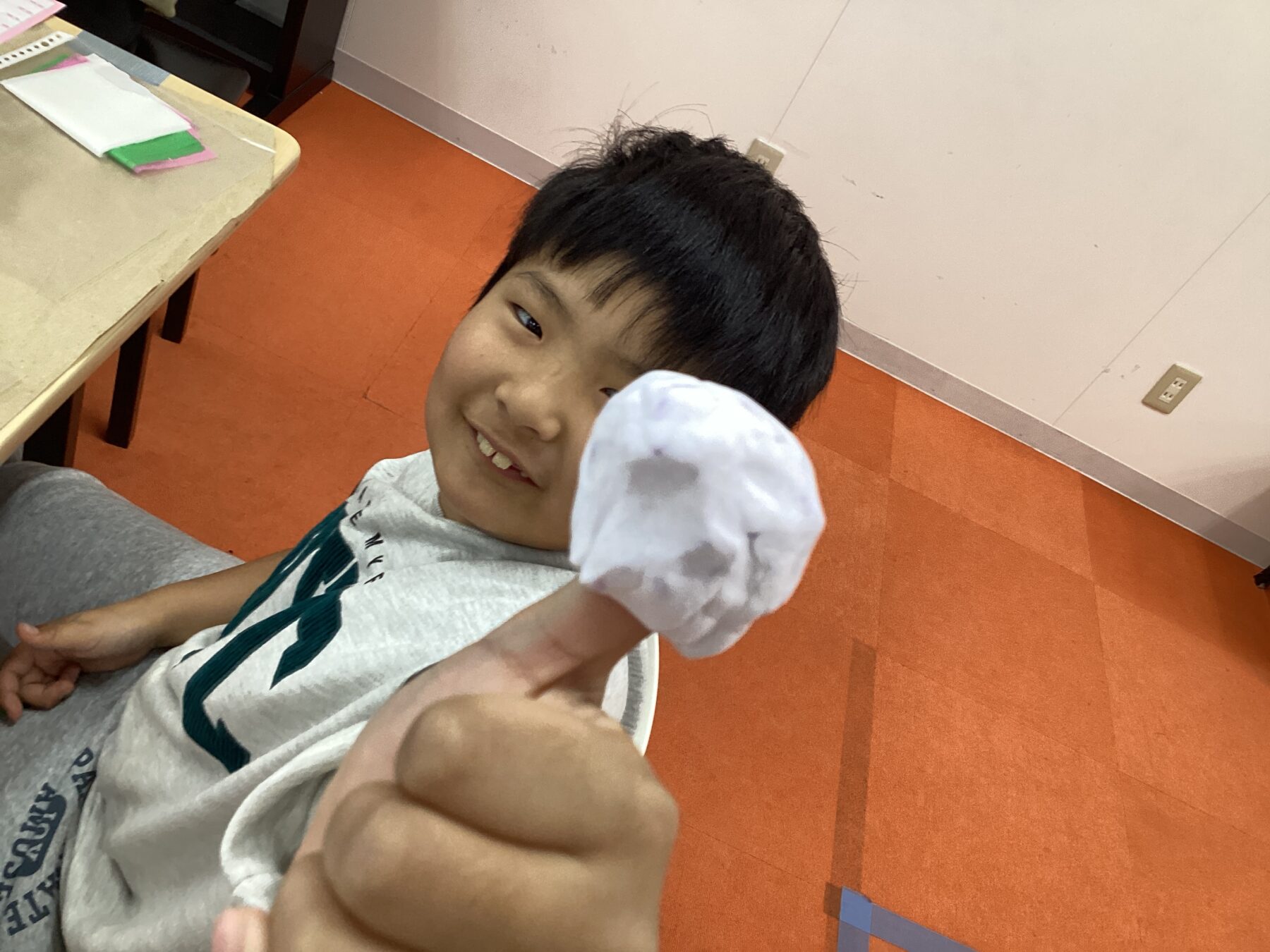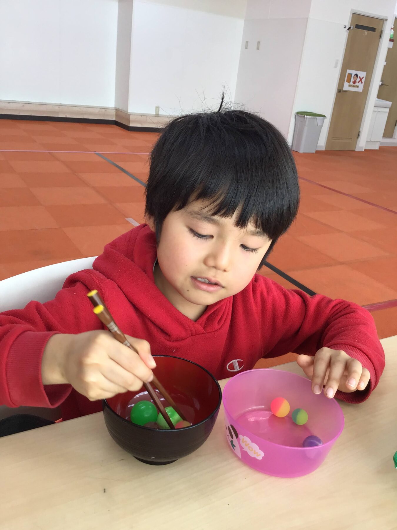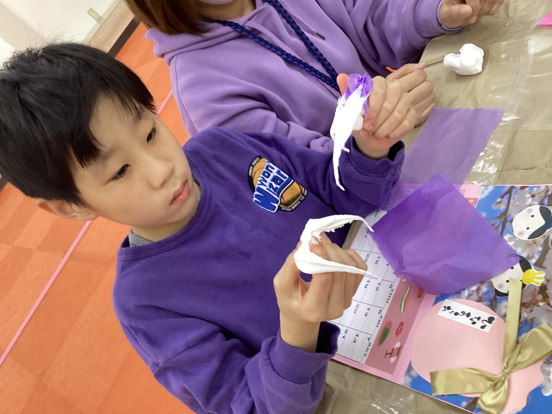 紙粘土にお花紙で色を付けたり、ひなあられに見立てて、緑、白、ピンクのお花紙を丸め貼る作業をしました!