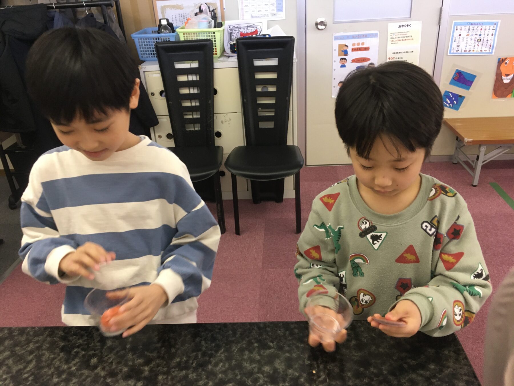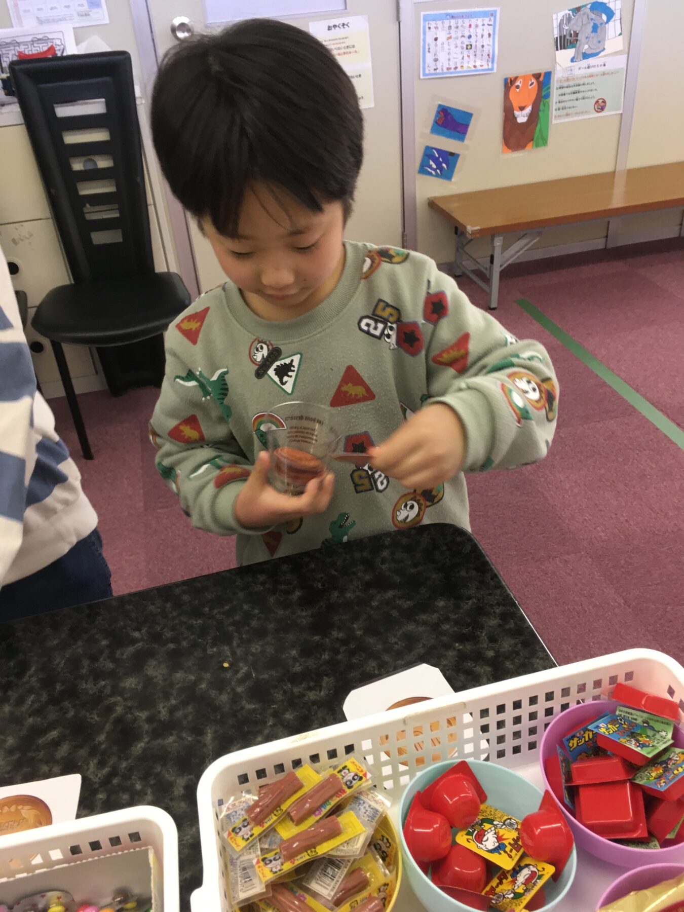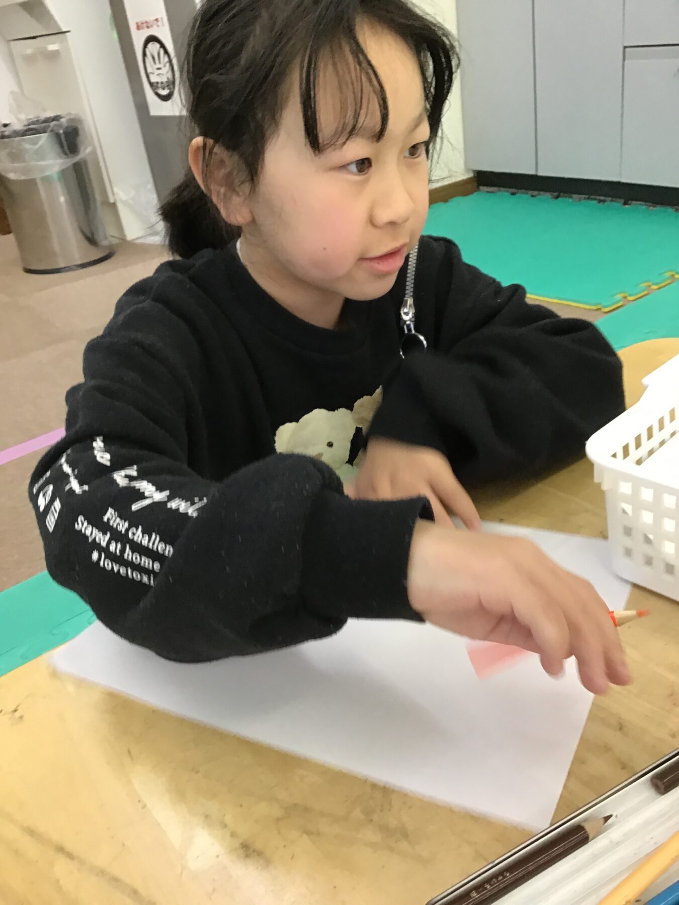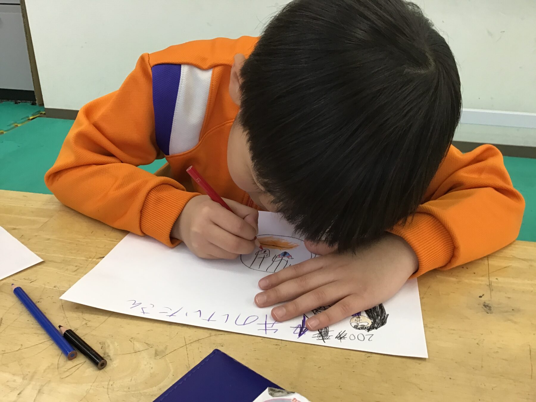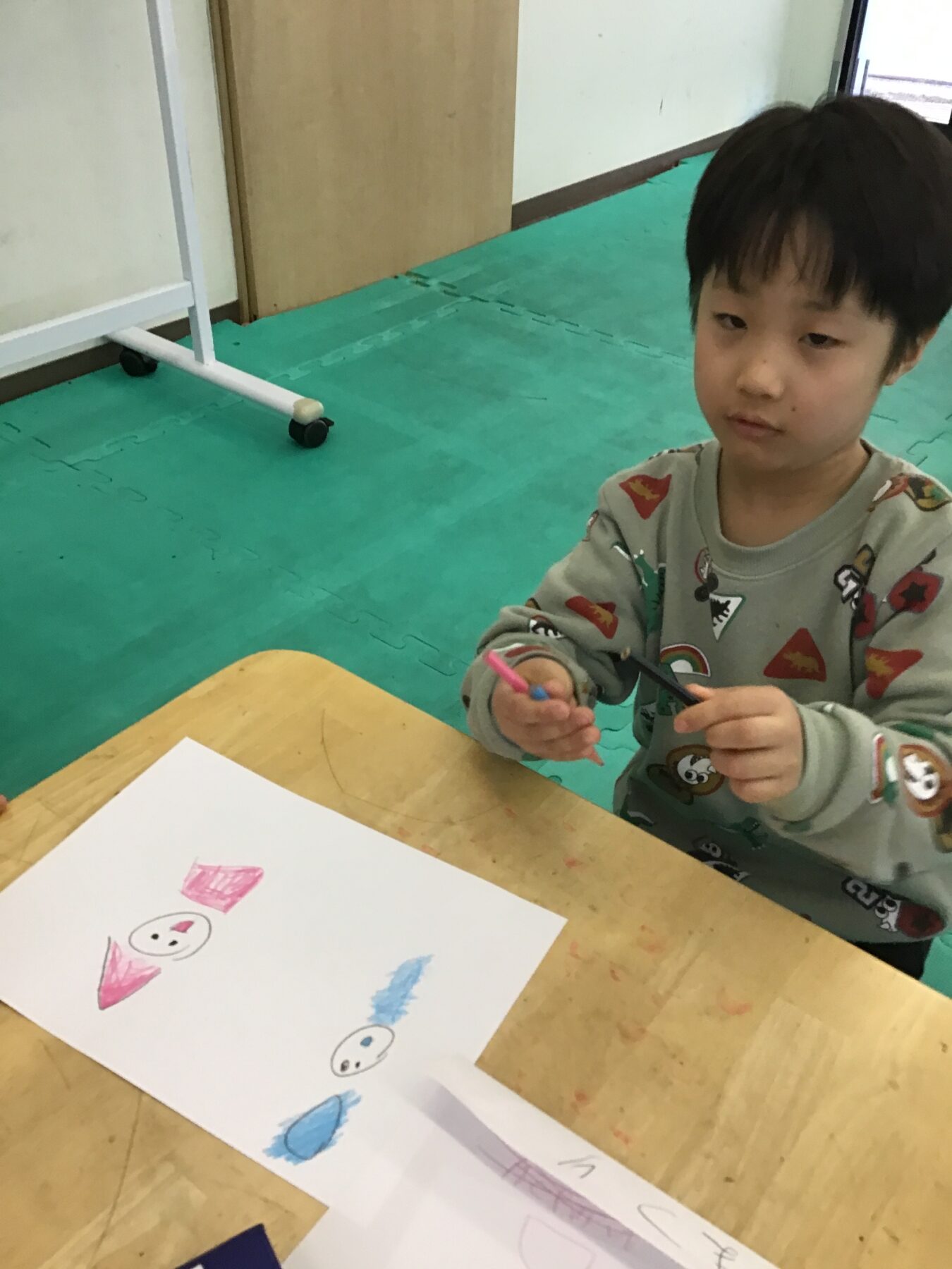二人づつ、お店に呼んでお買い物をしましたが、その間、待っているお友達は、今日は、自分の【推し】のお絵描きに取り組みました。色鉛筆、マーカーなどを使って思い思いに描きました。
