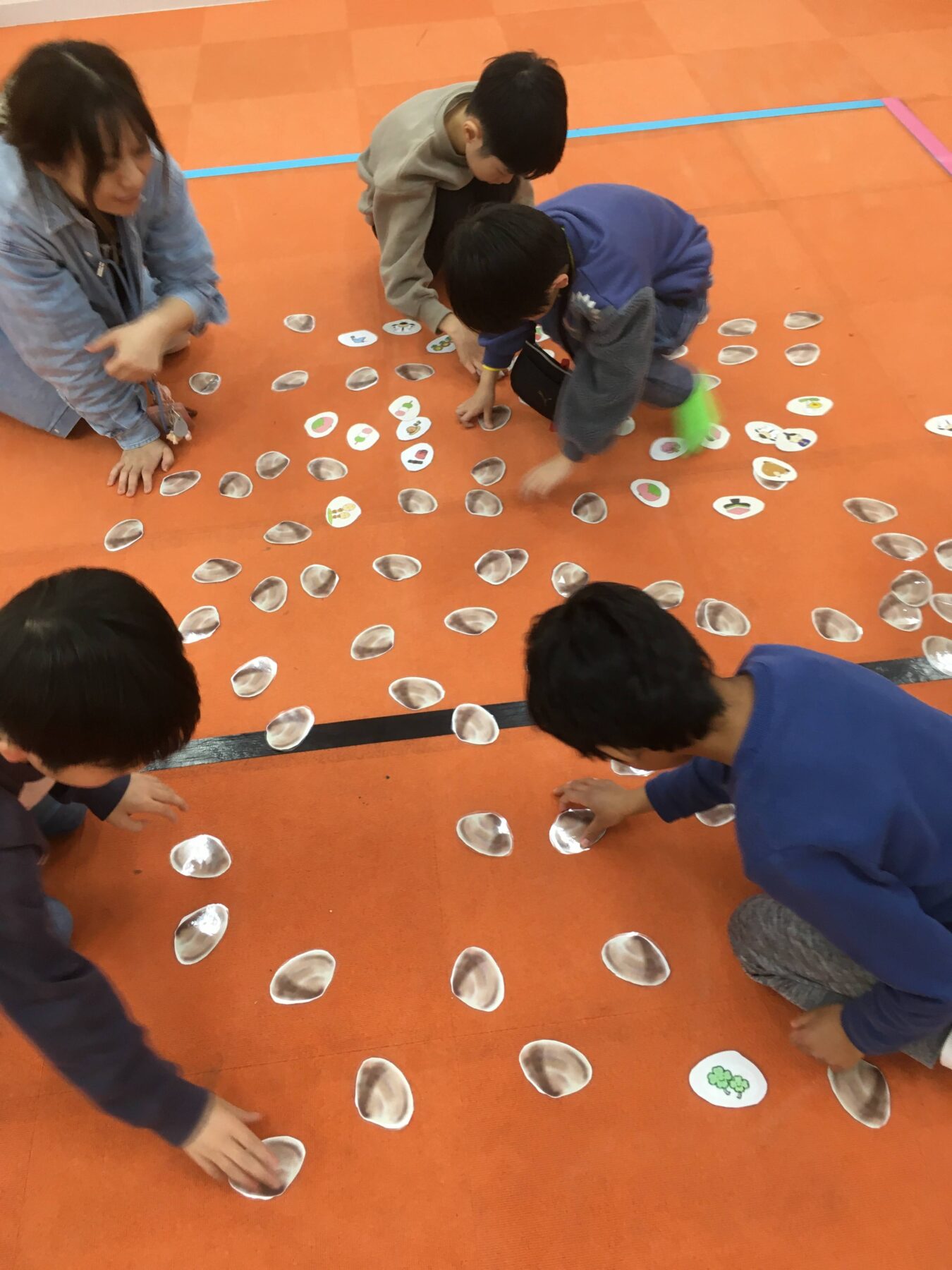 はまぐりのカードをめくって、同じイラストの描いているカードを2枚集めるルールです。