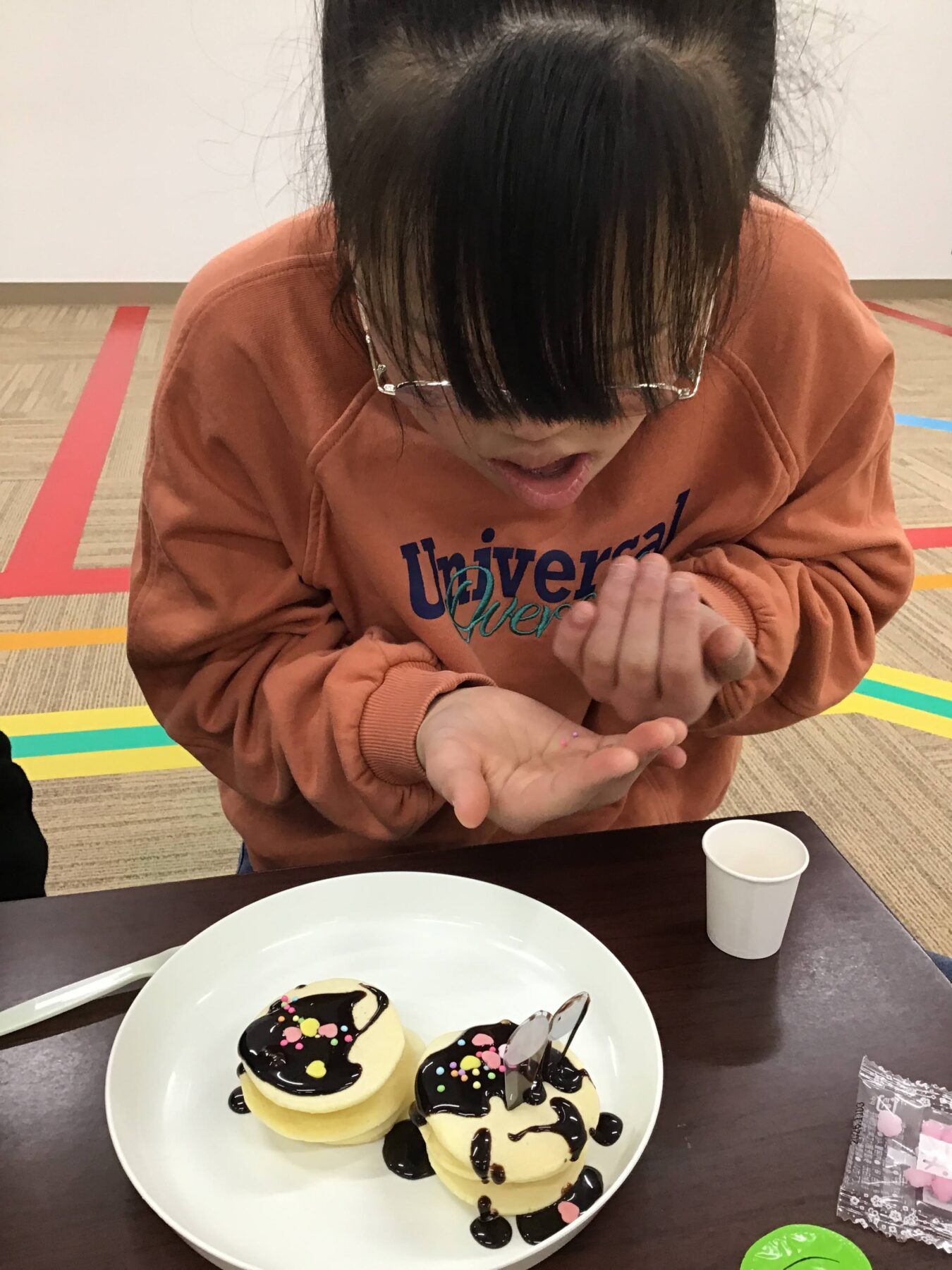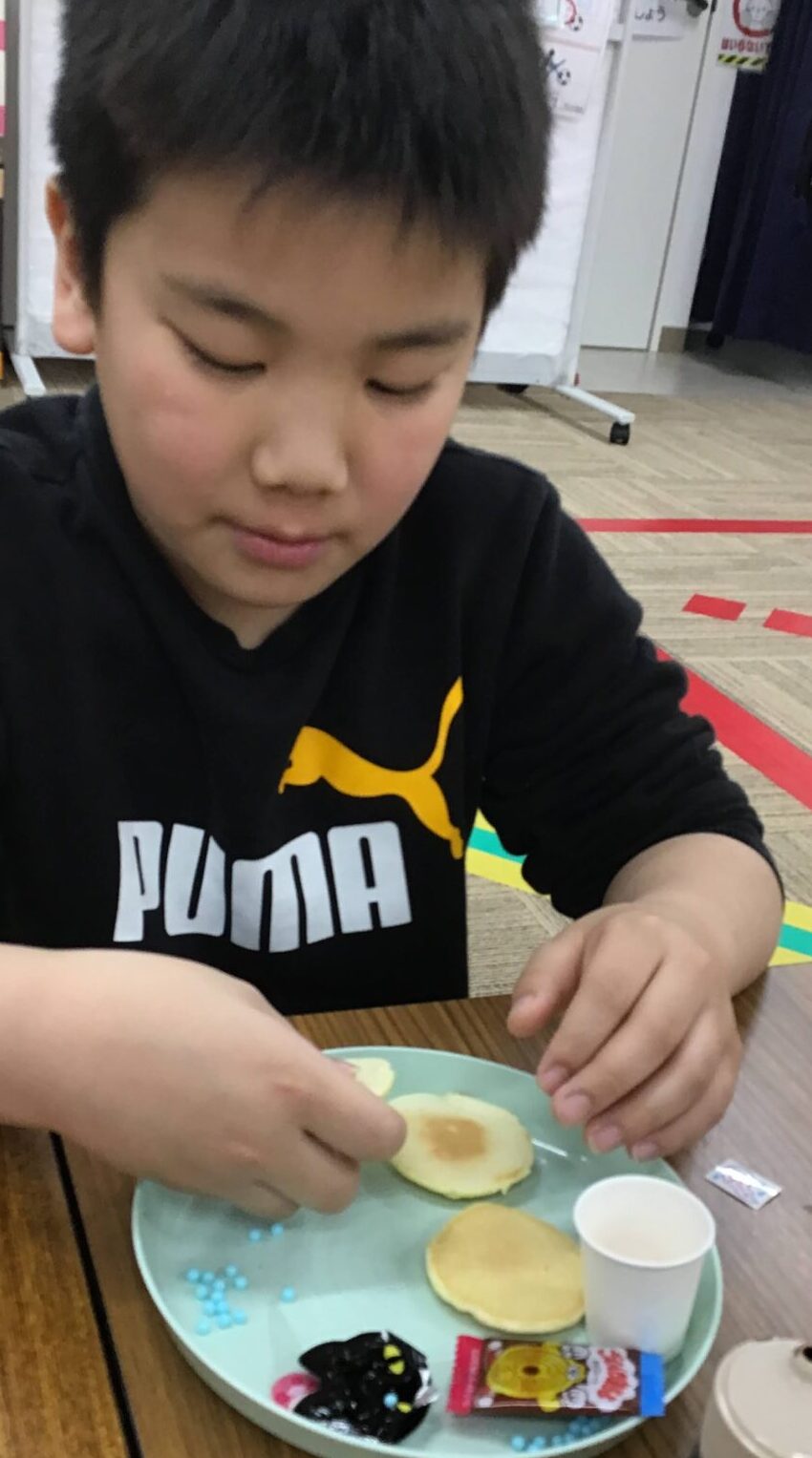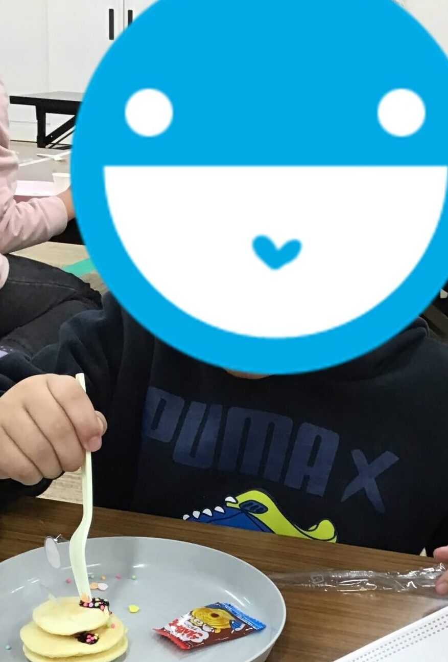 完成しているホットケーキにチョコソース・カラースプレー・こんぺいとうなどを使い、デコレーションしていただきました✨
