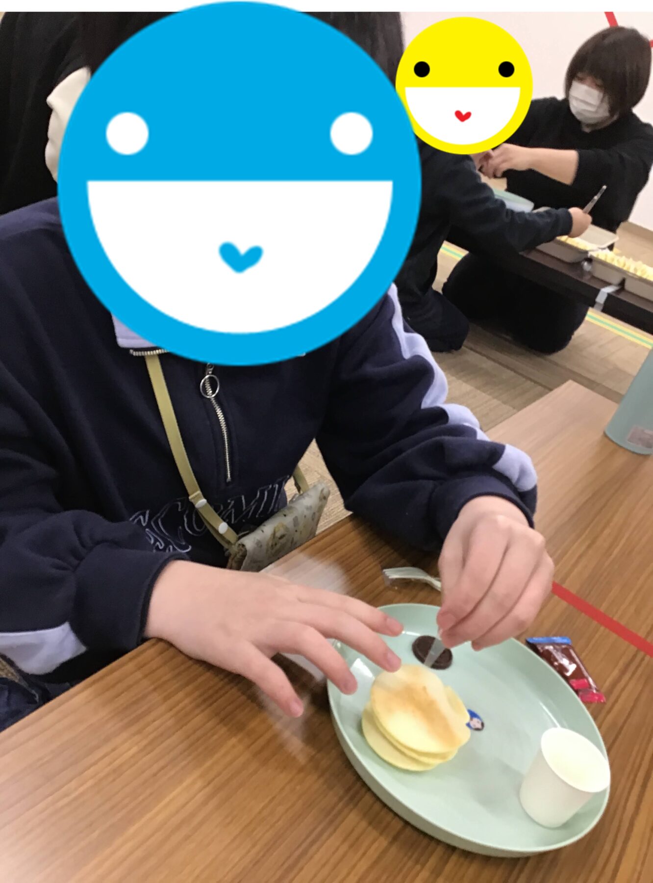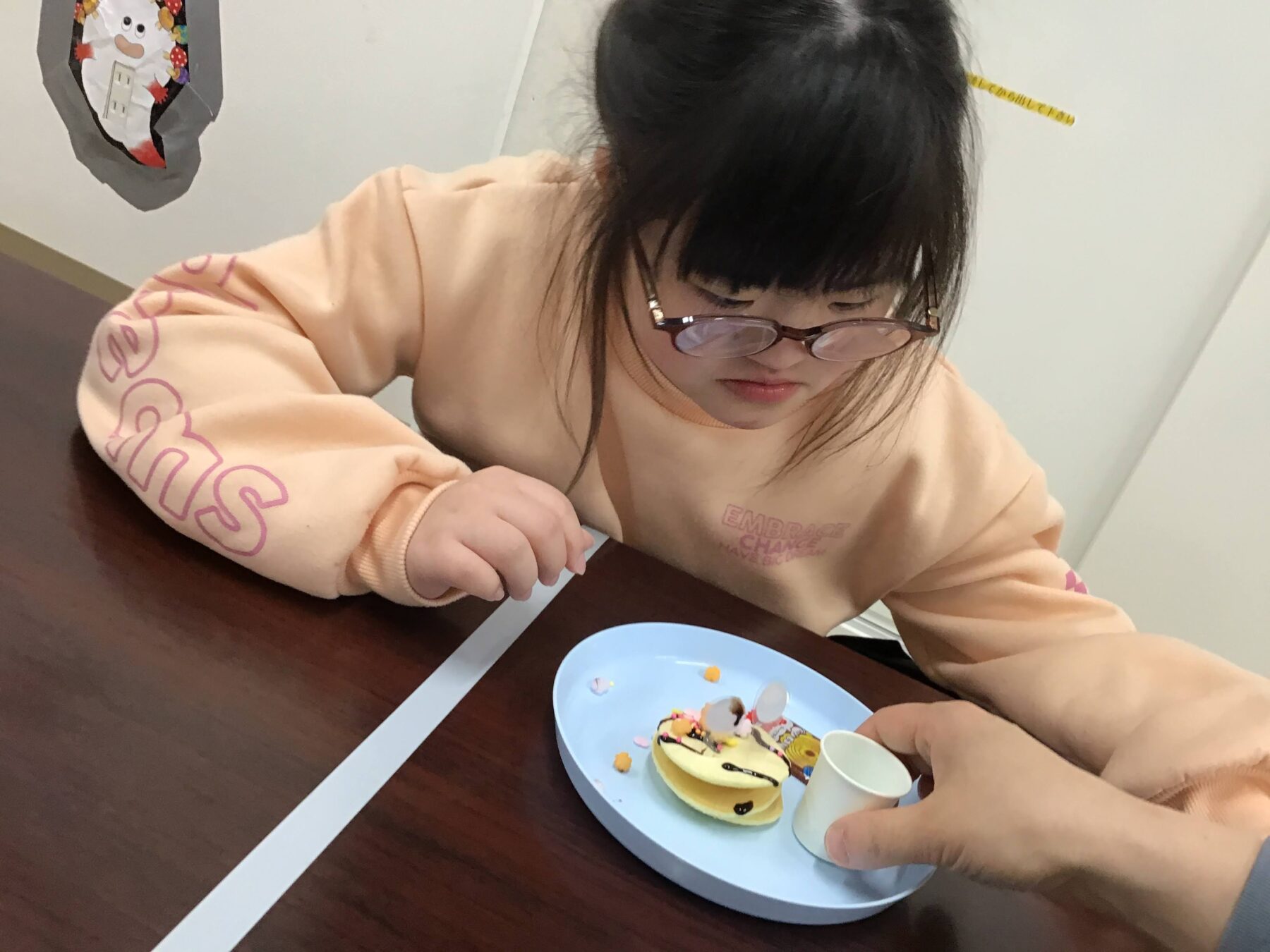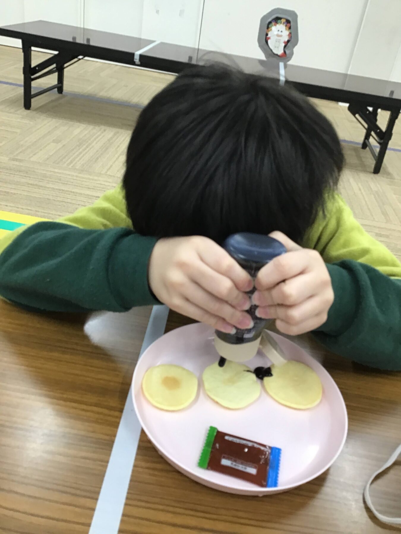 完成しているホットケーキにチョコソース・カラースプレー・こんぺいとうなどを使い、デコレーションしていただきました✨