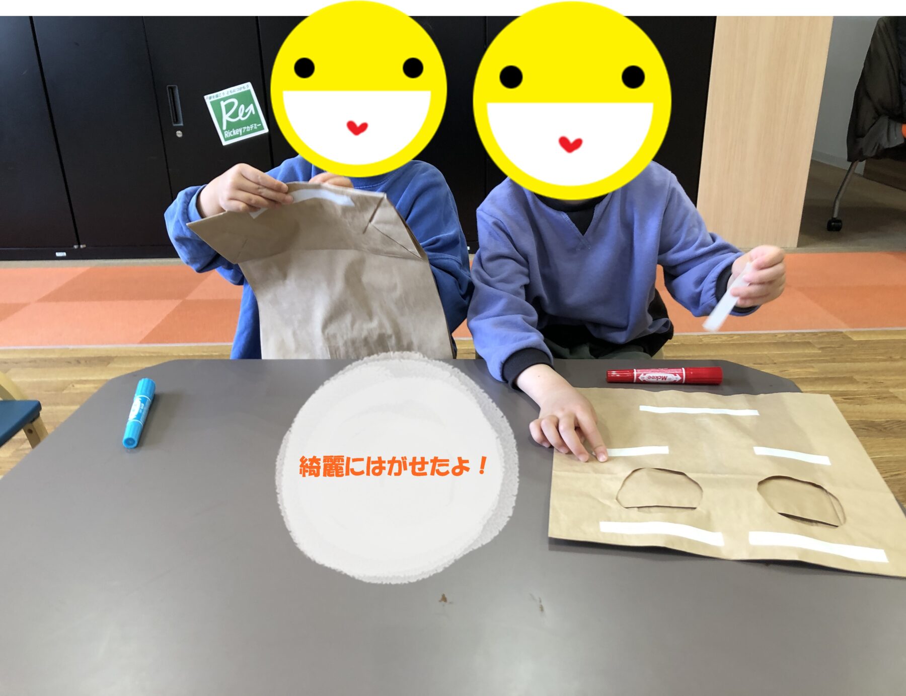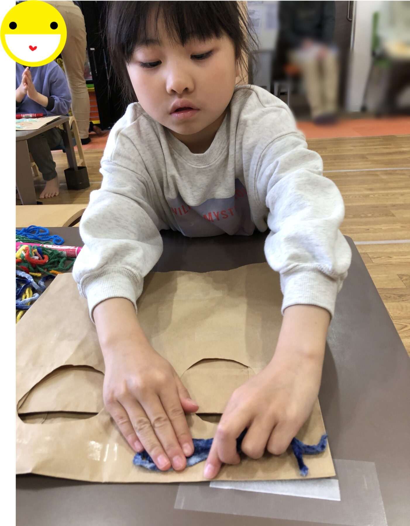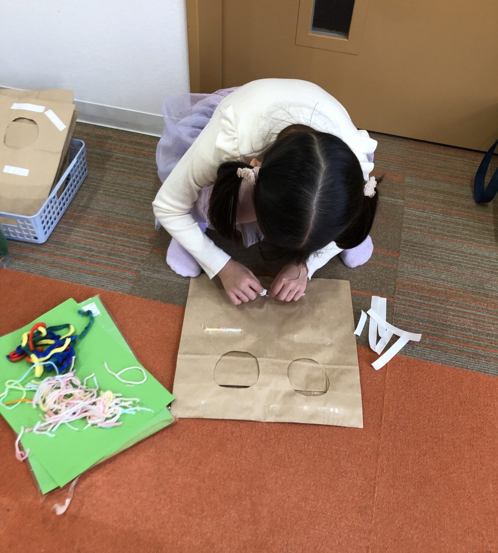 紙袋に、マジックペンで絵を描いたり、両面テープを使って毛糸を貼り付け、お面を作ります!