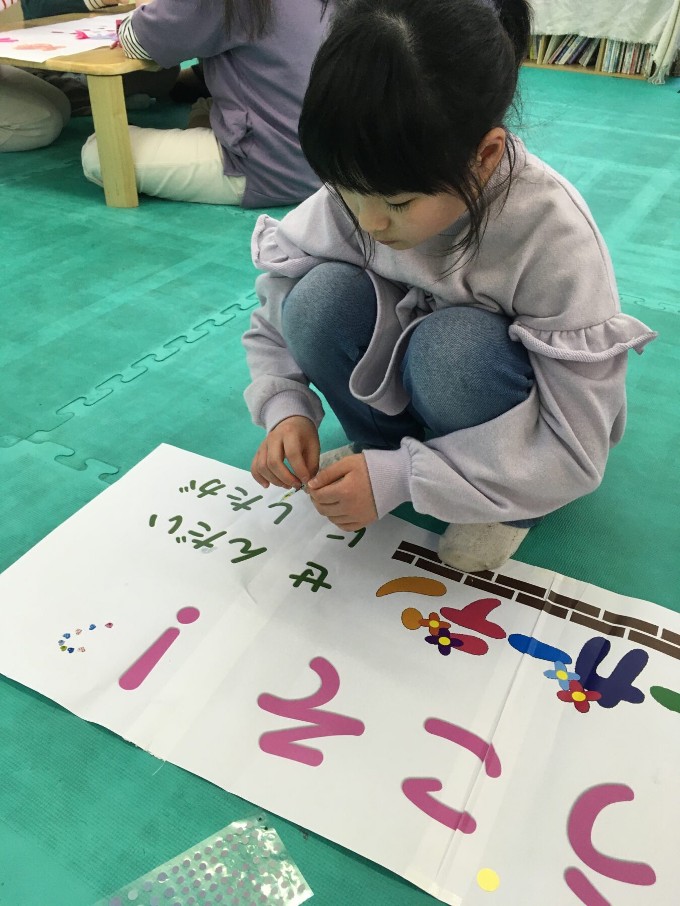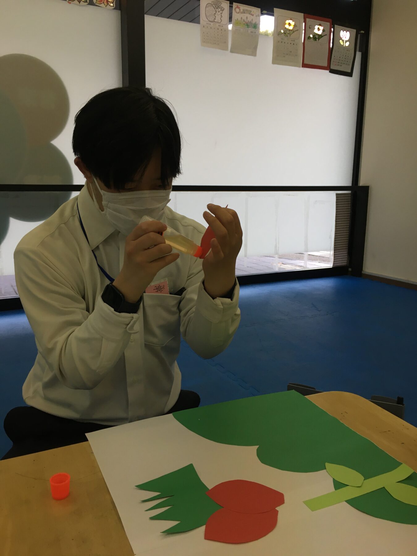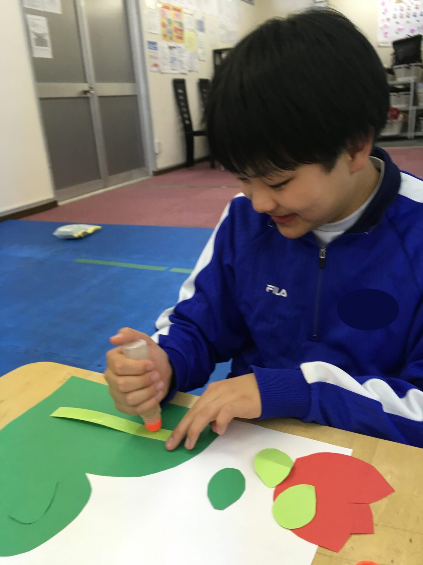 お花や、草むらなどを製作していきます。のりを使う時は、お友だちと声を掛け合いながら使いましたよ(*´ω`*)