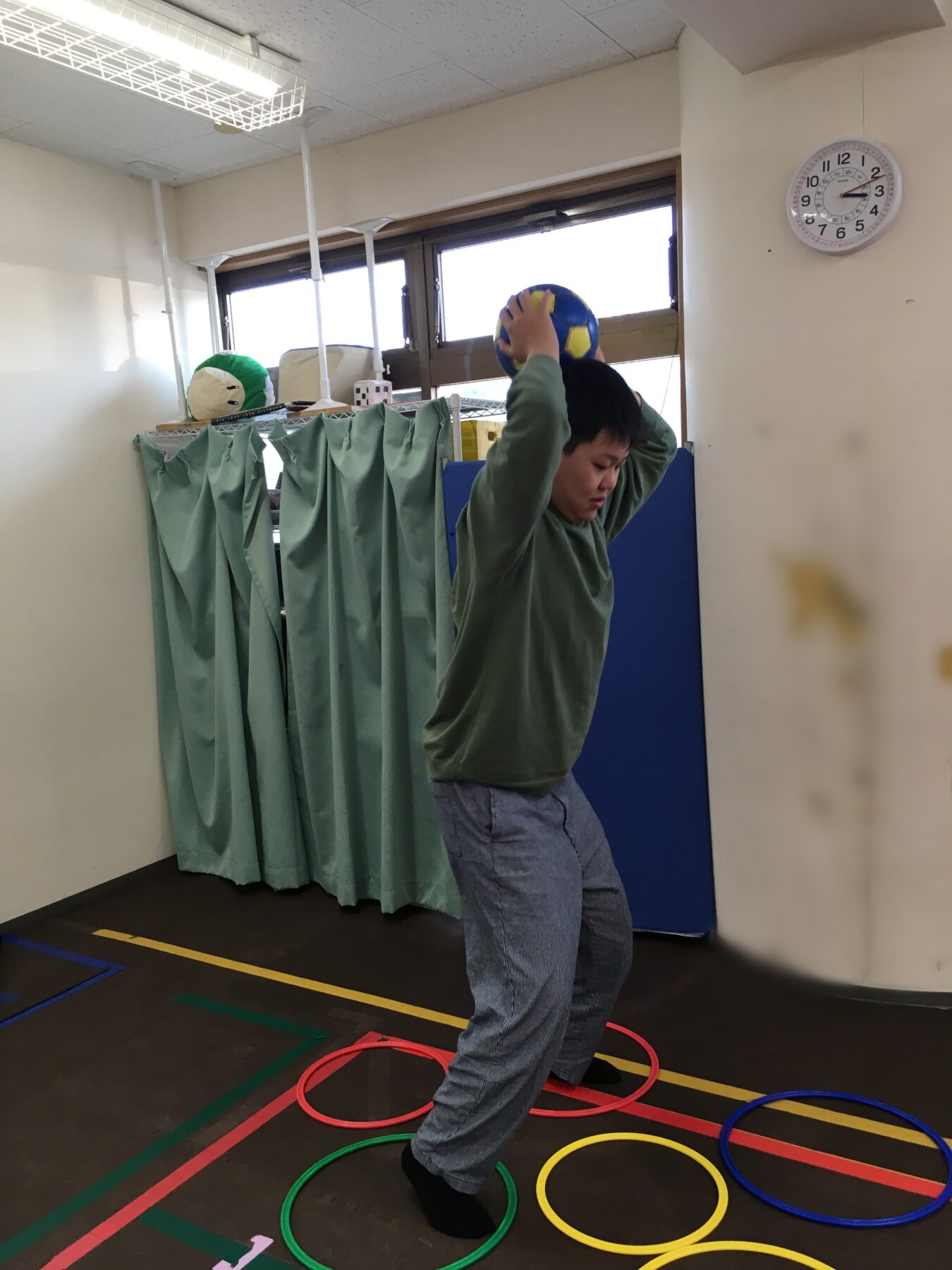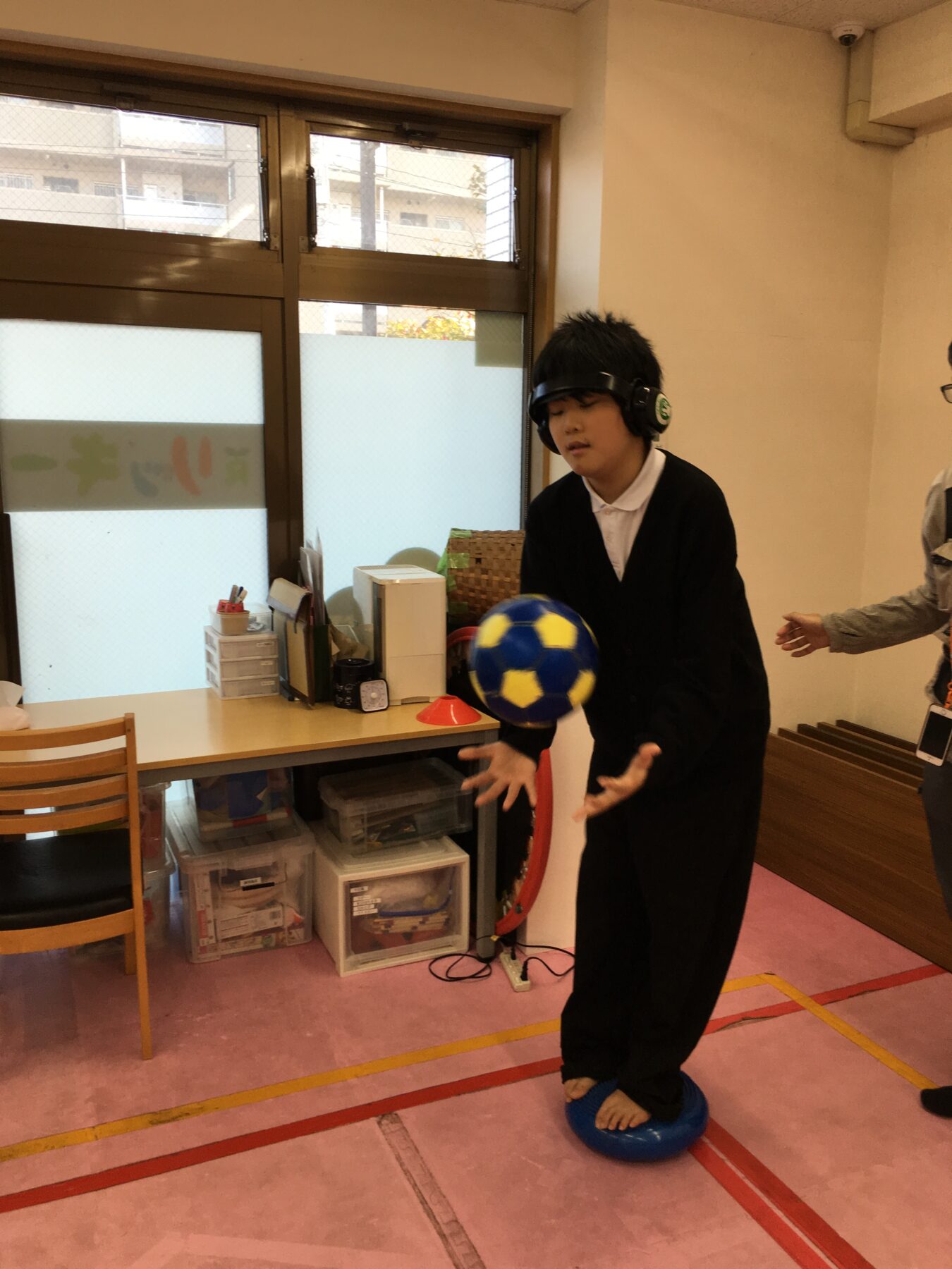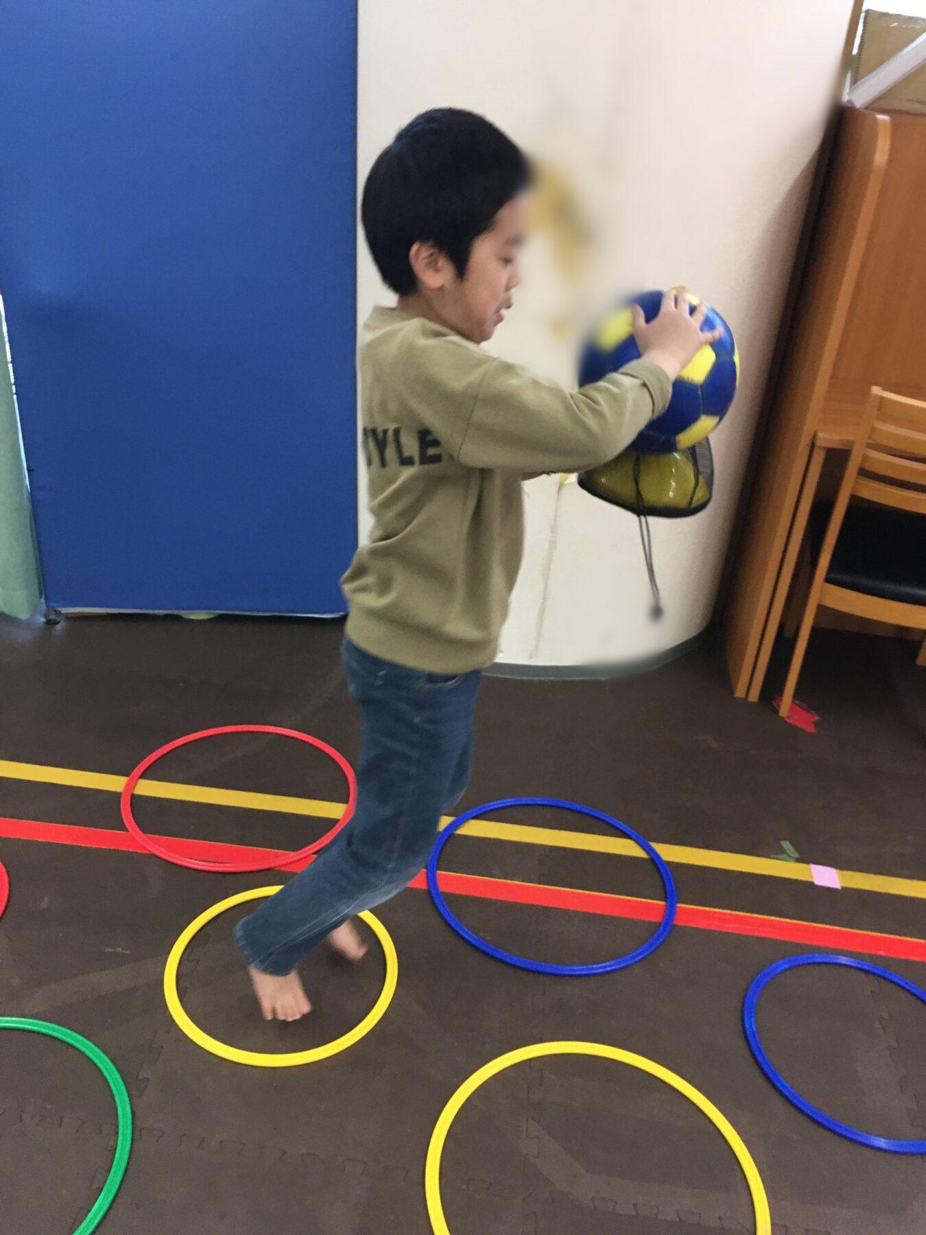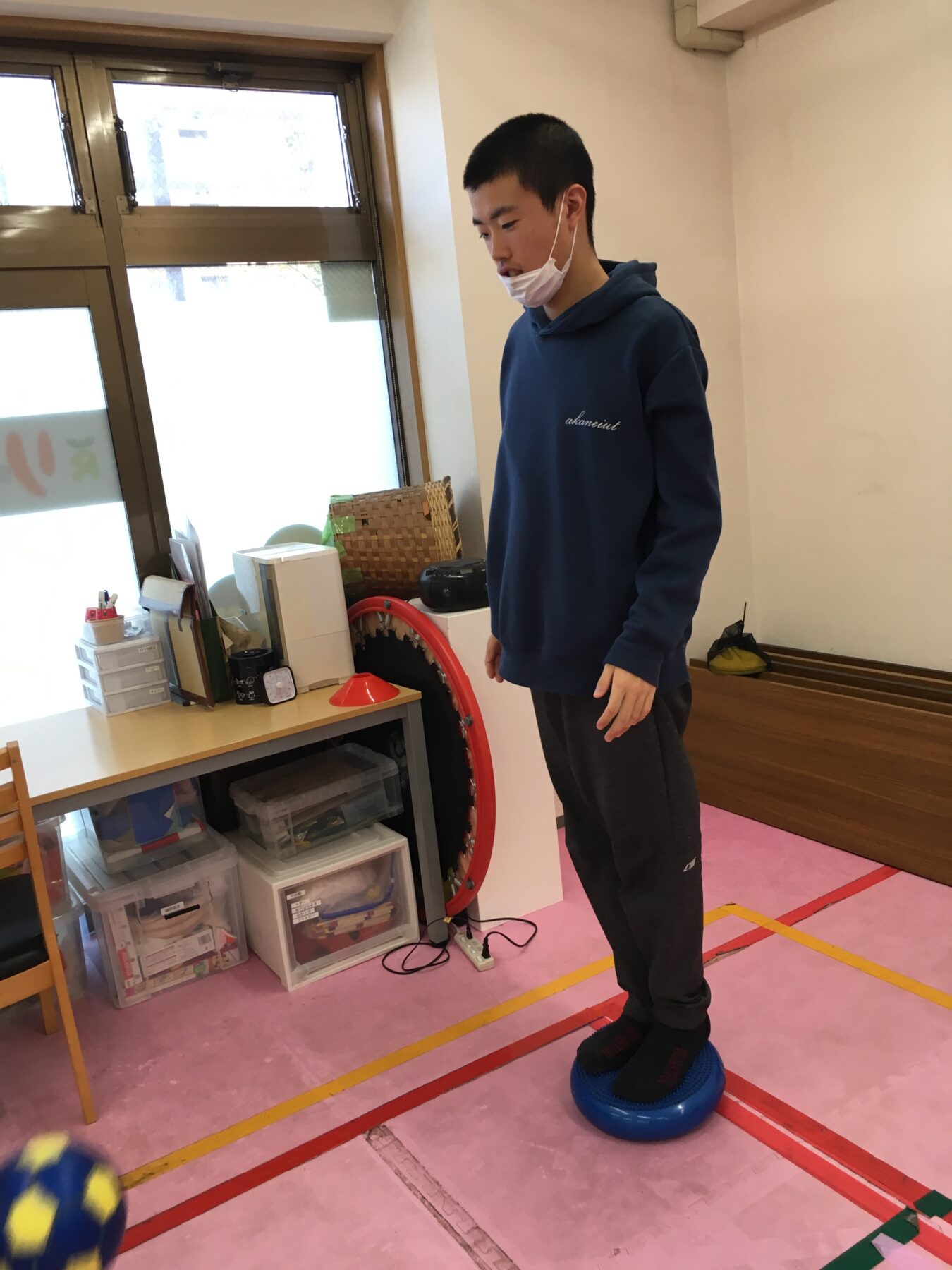 ②バランスマットの上で、ボールキャッチ