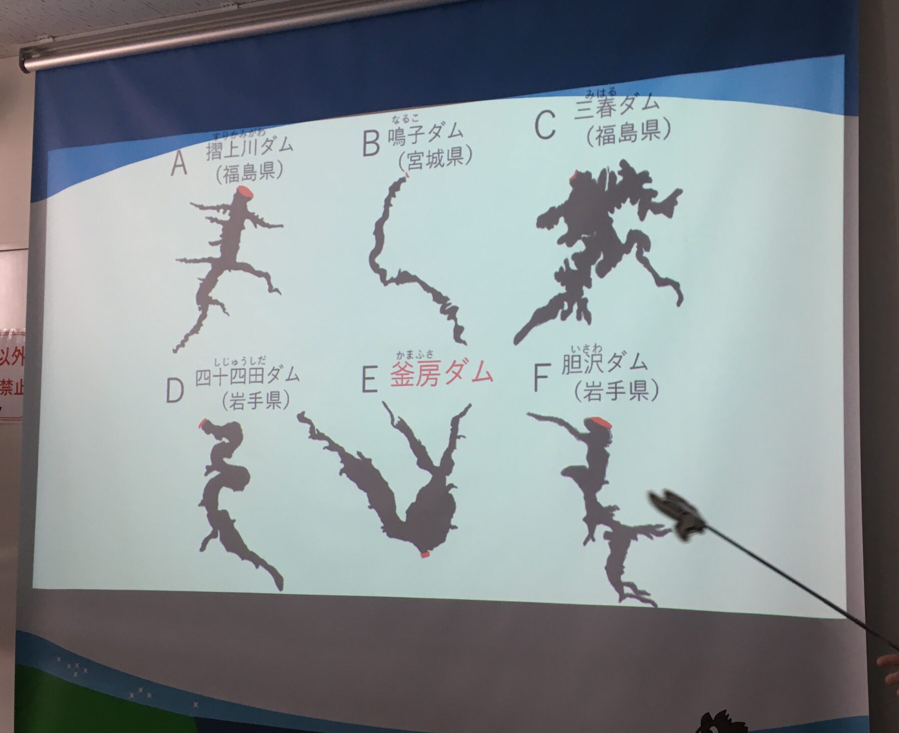 皆さんも考えてみてくださいね。それでは問題です。「釜房ダムのダム湖はどれでしょう?」