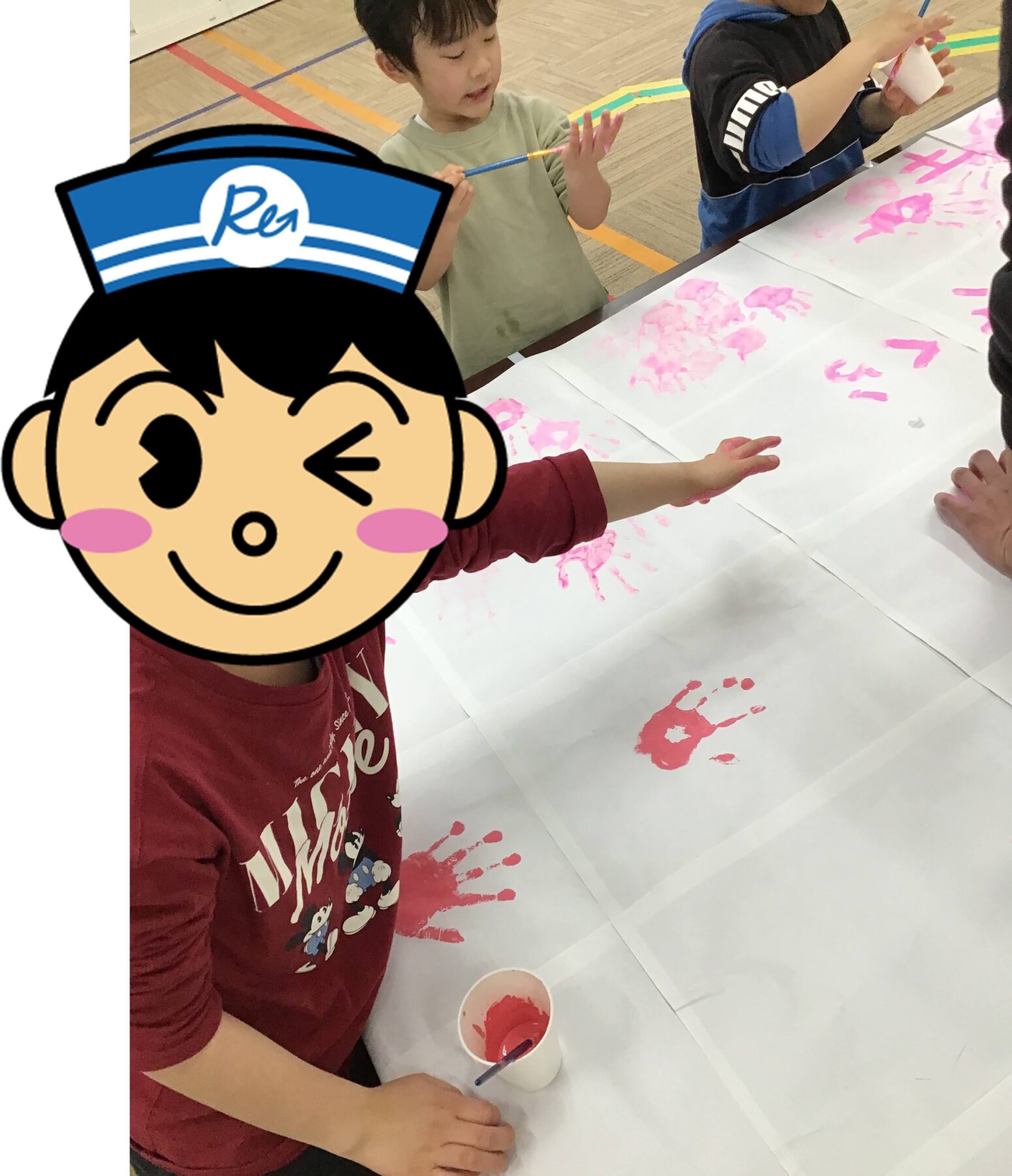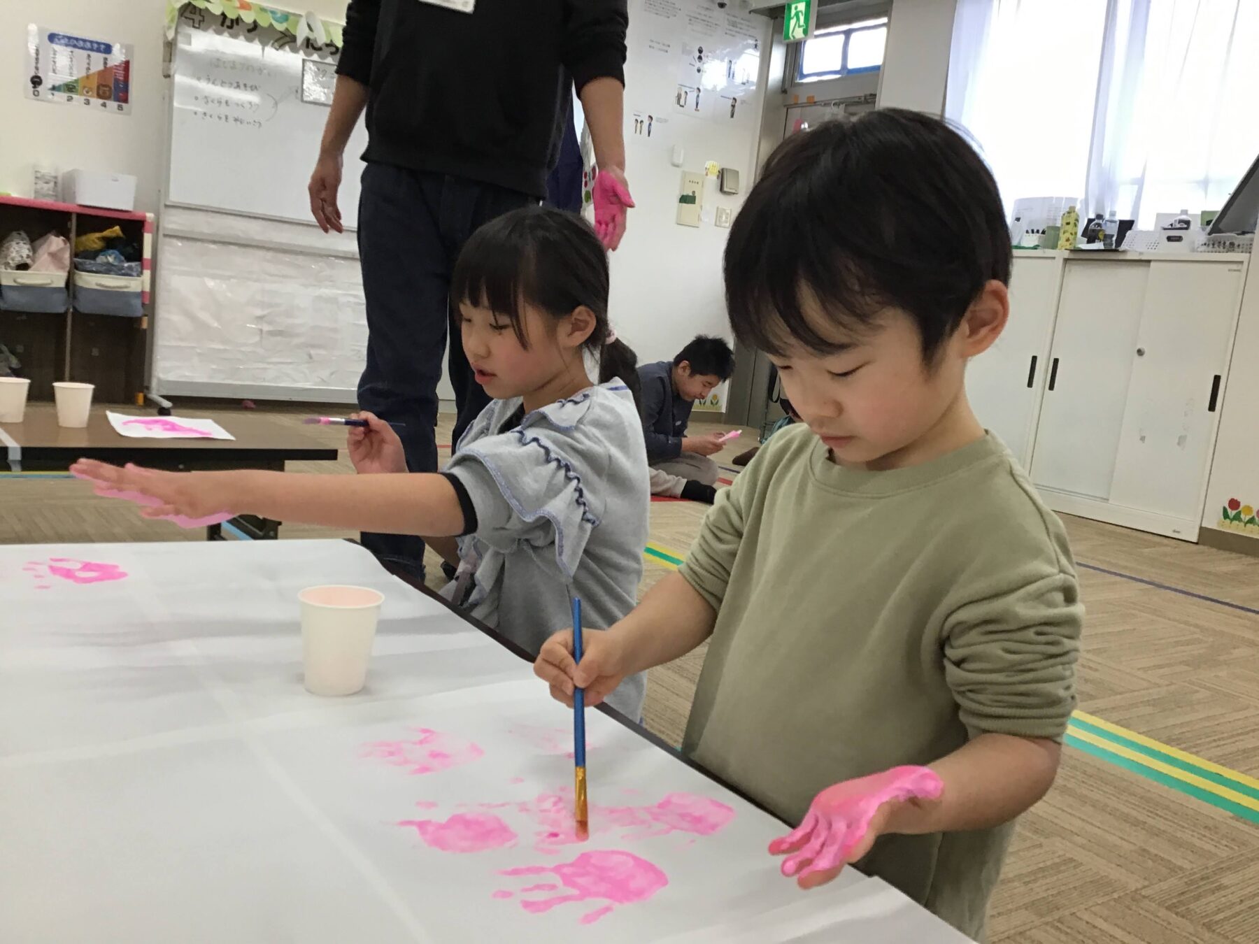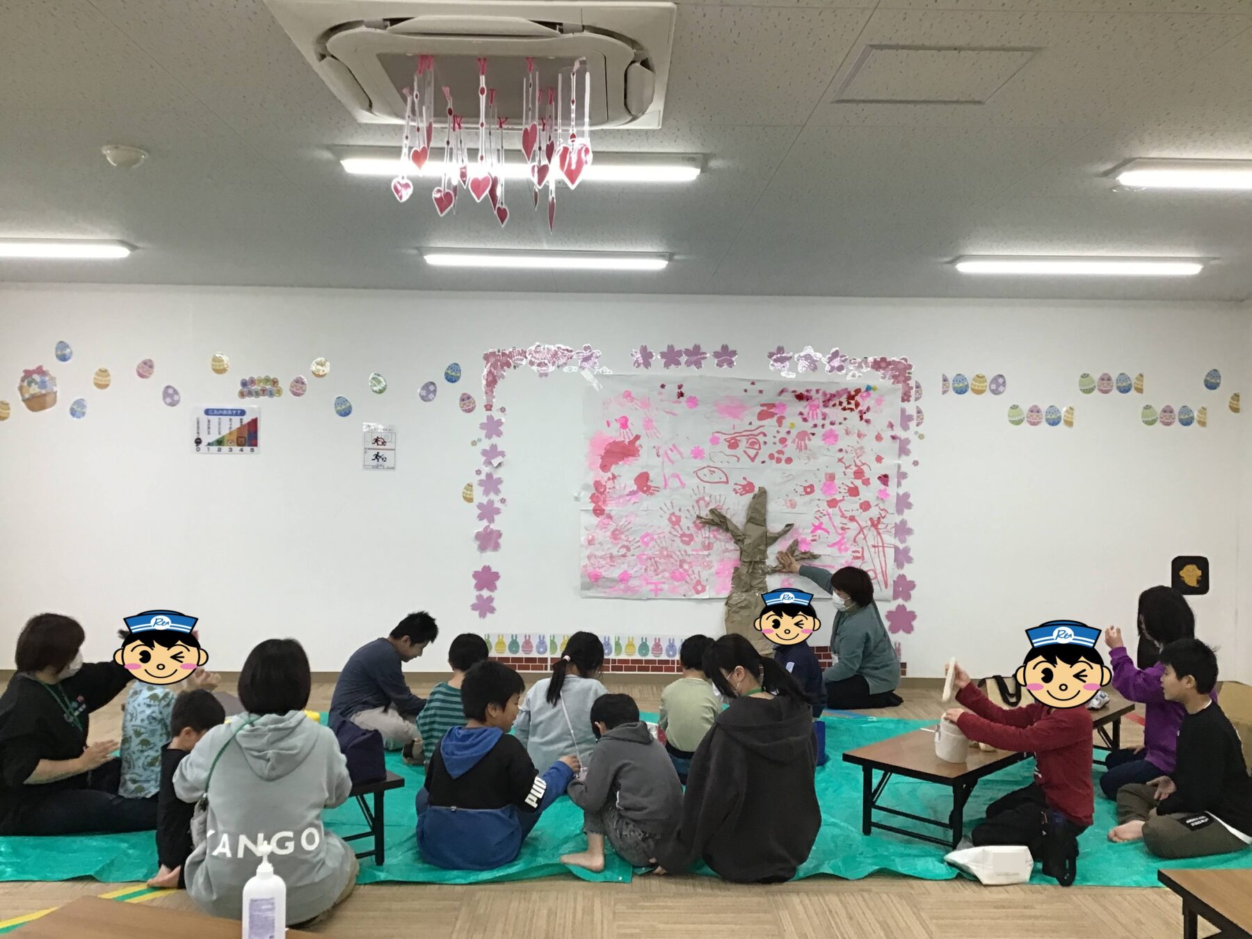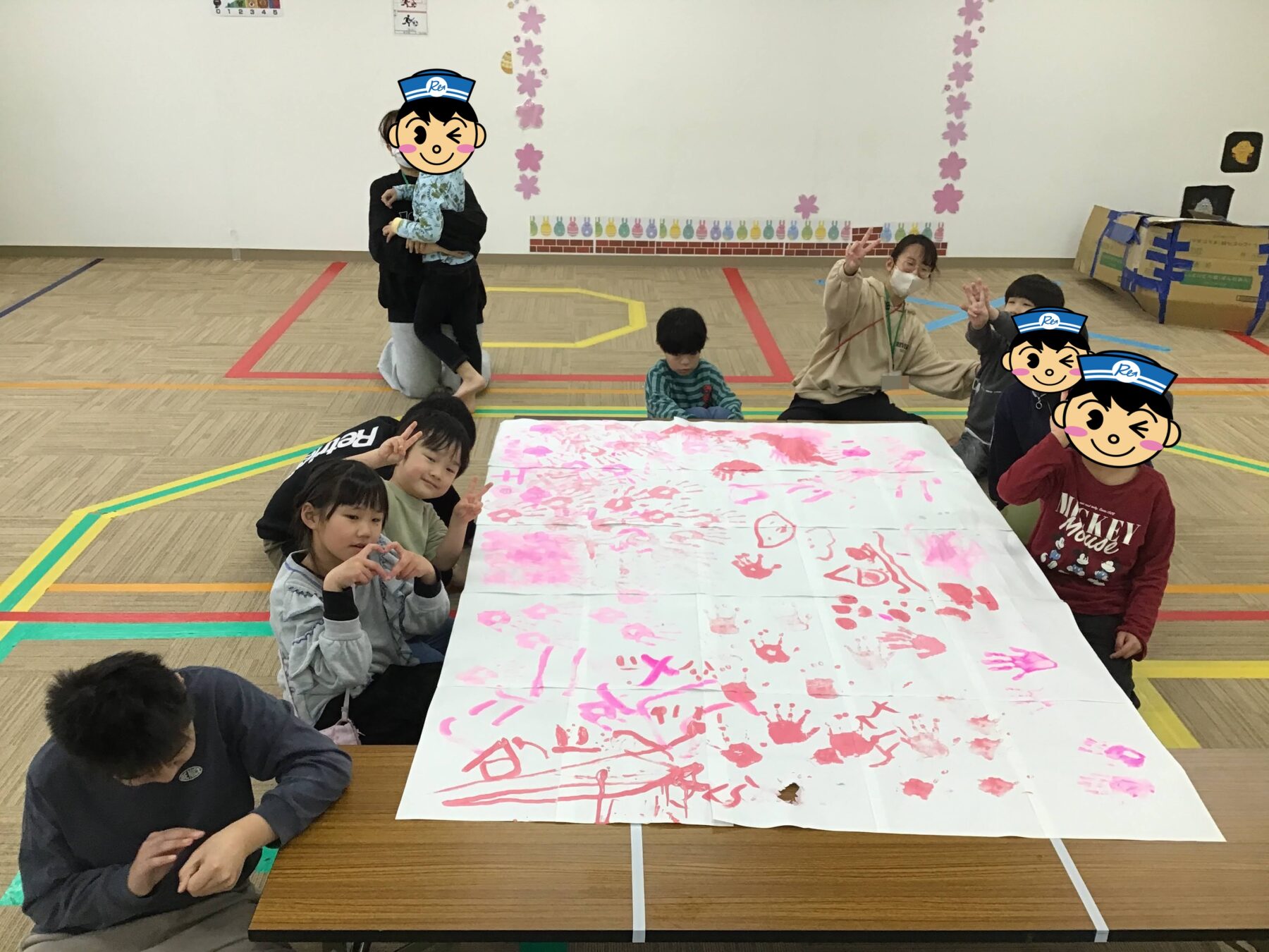 お花見ピクニックをより楽しめるよう室内活動では、ピンクの絵の具を使って手形スタンプをみんなでペタペタ貼り付けて「さくら作り」を行いました。