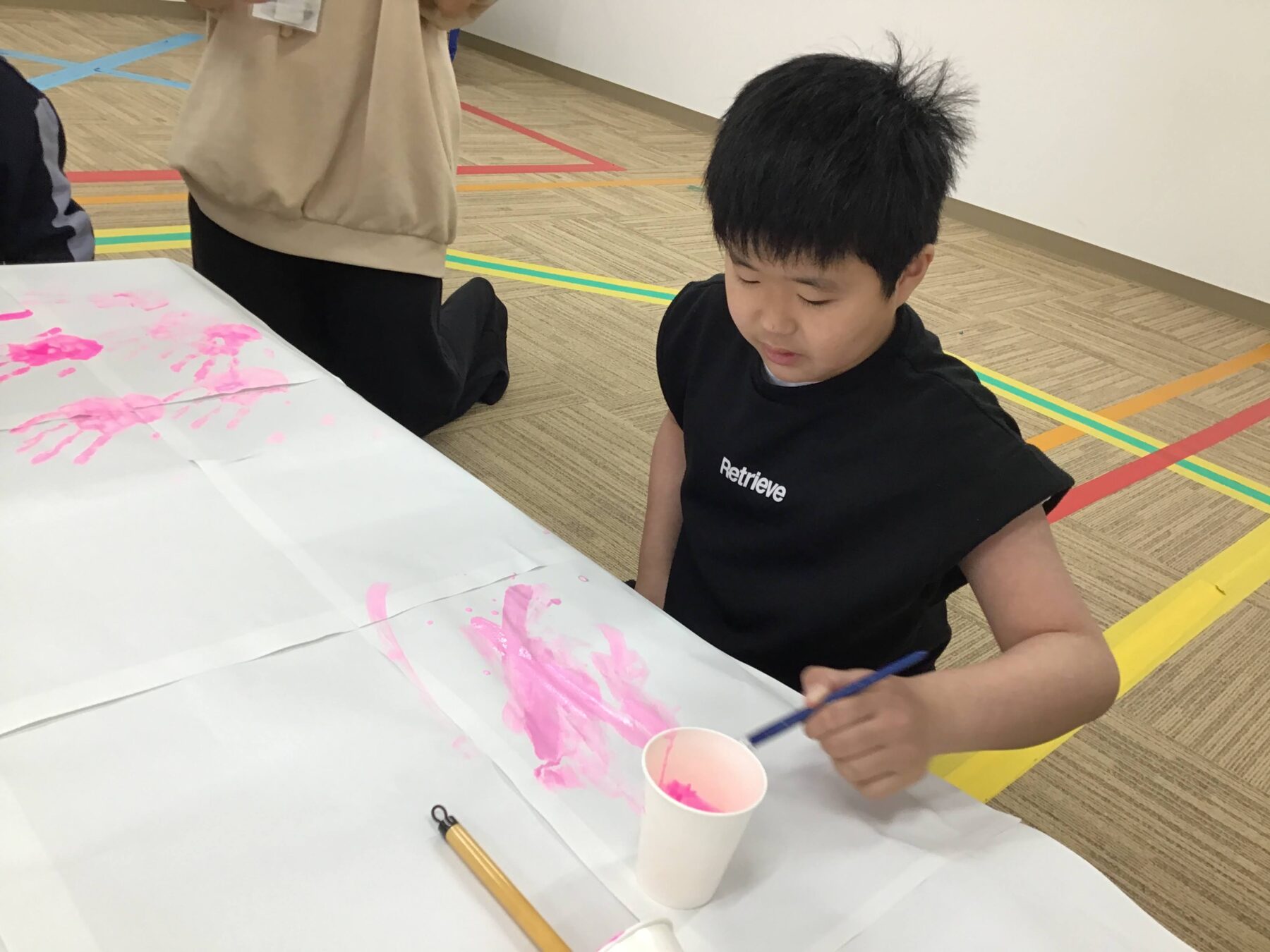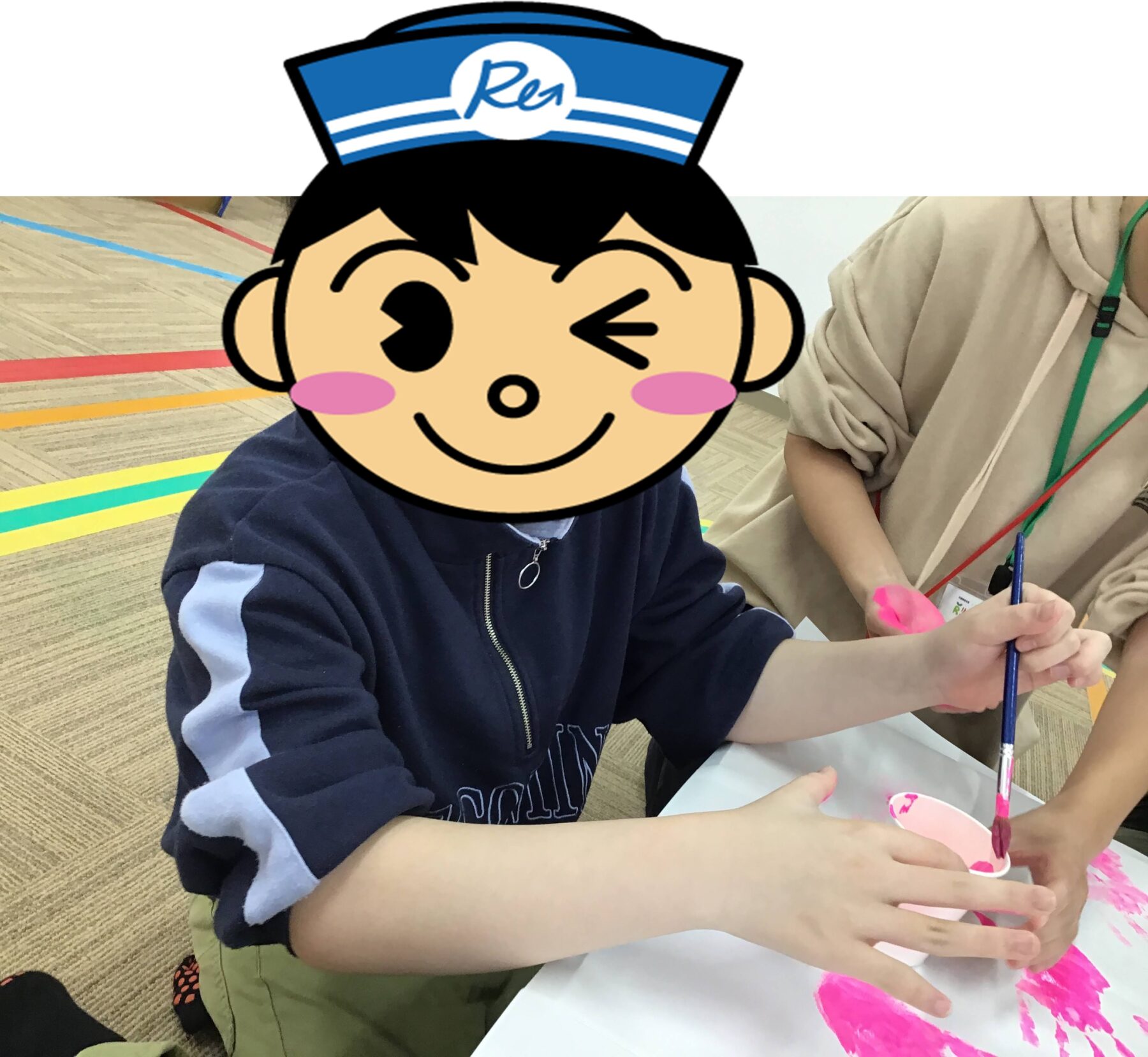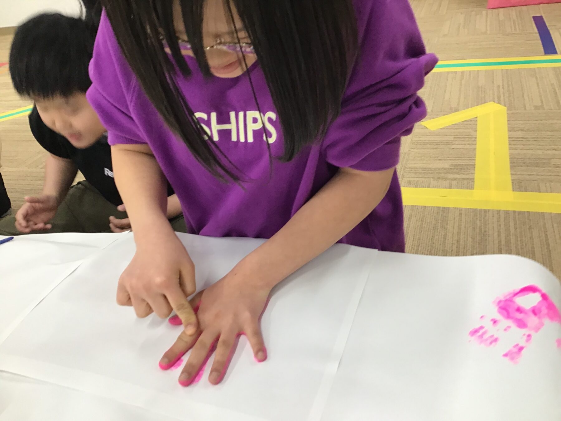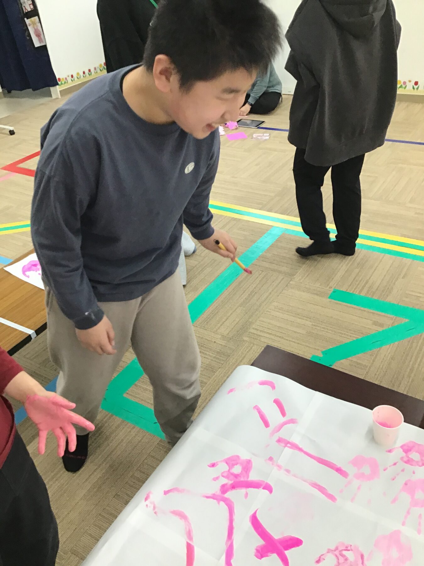 お花見ピクニックをより楽しめるよう室内活動では、ピンクの絵の具を使って手形スタンプをみんなでペタペタ貼り付けて「さくら作り」を行いました。