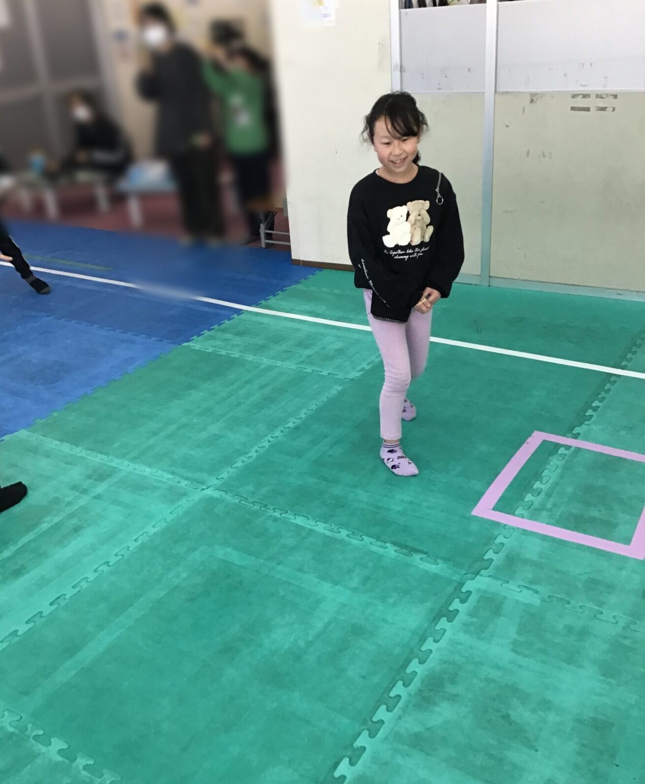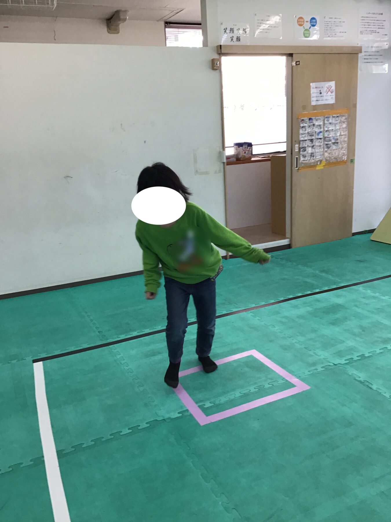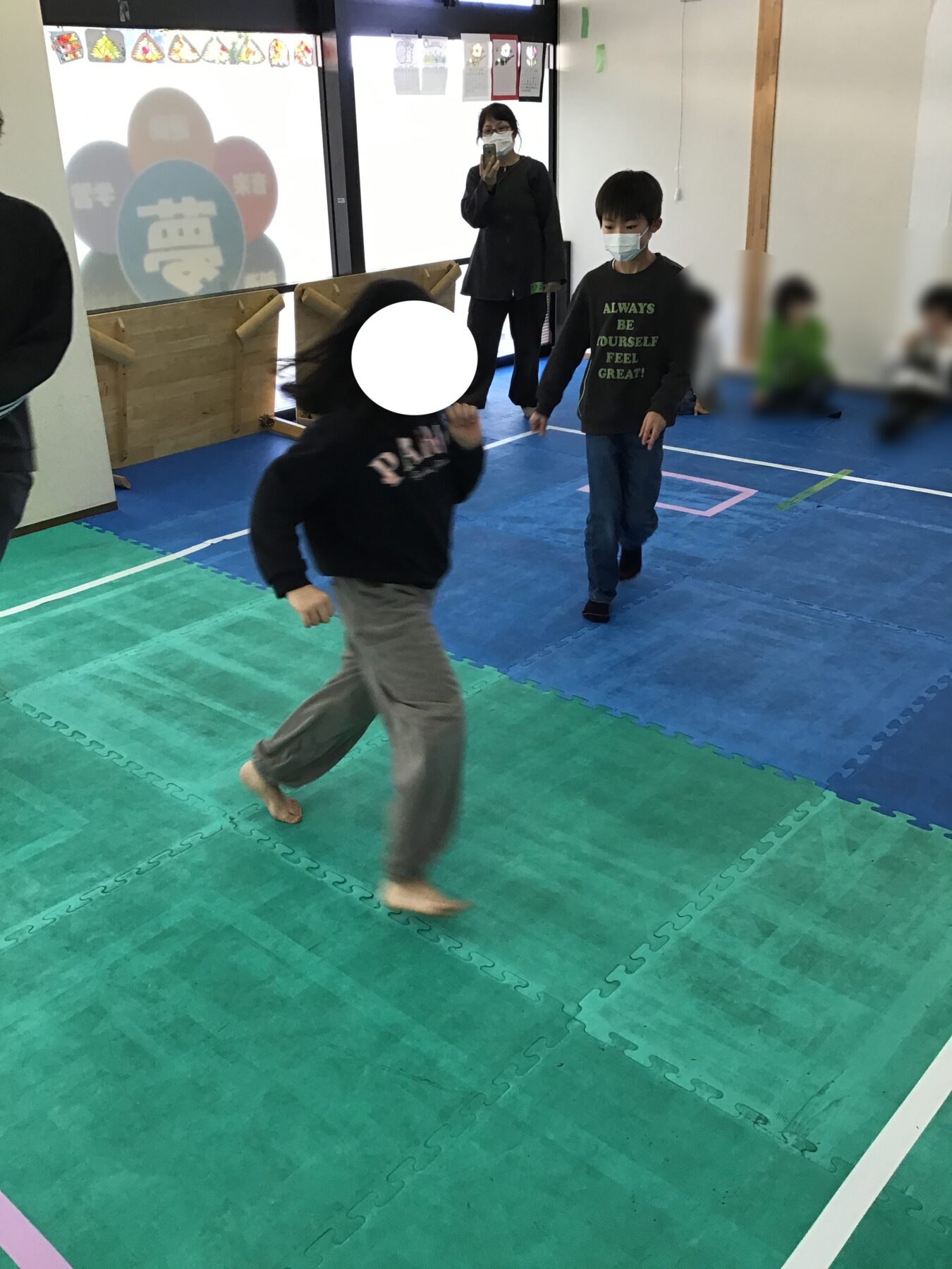 音楽が鳴っている間は動いて、音楽が止まったら鬼に捕まる前に枠の中に入ります。