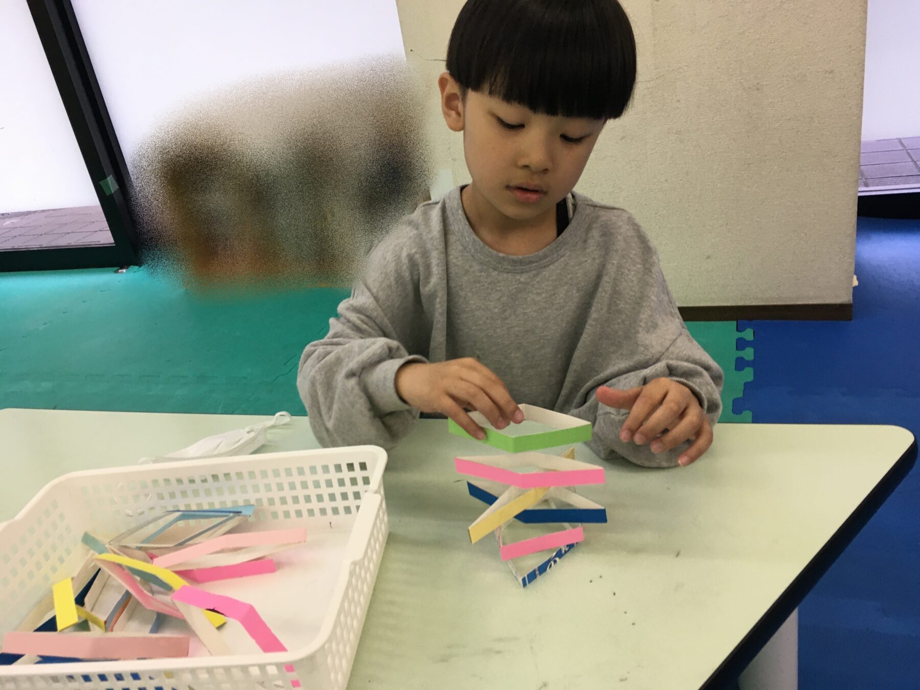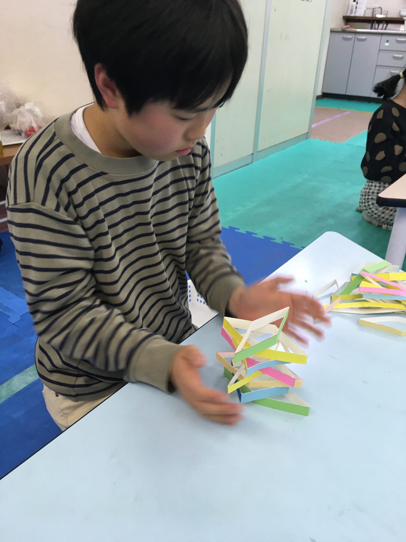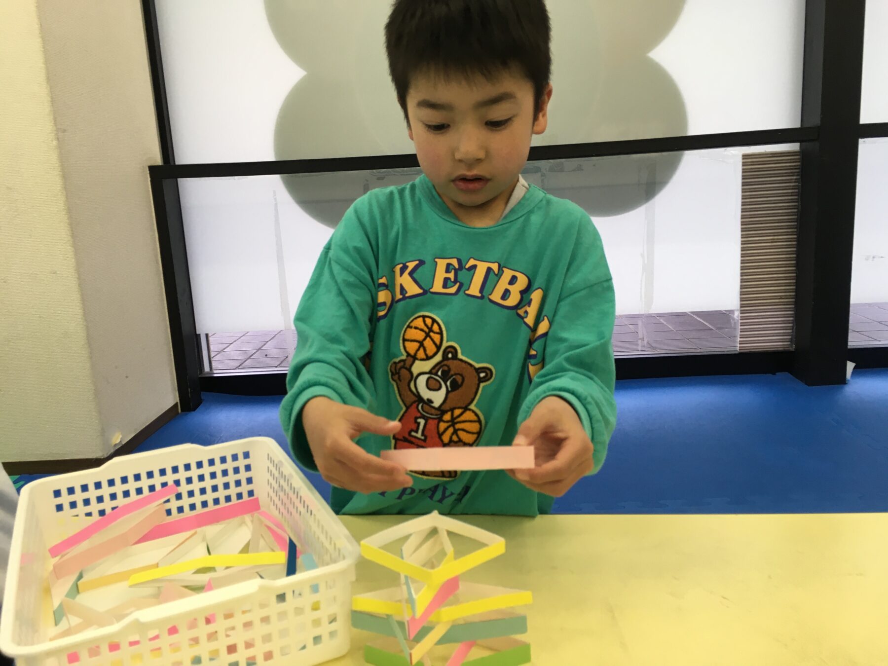 今日は【感覚・認知】の活動で、牛乳パックを細長く切ったものを積み上げていく