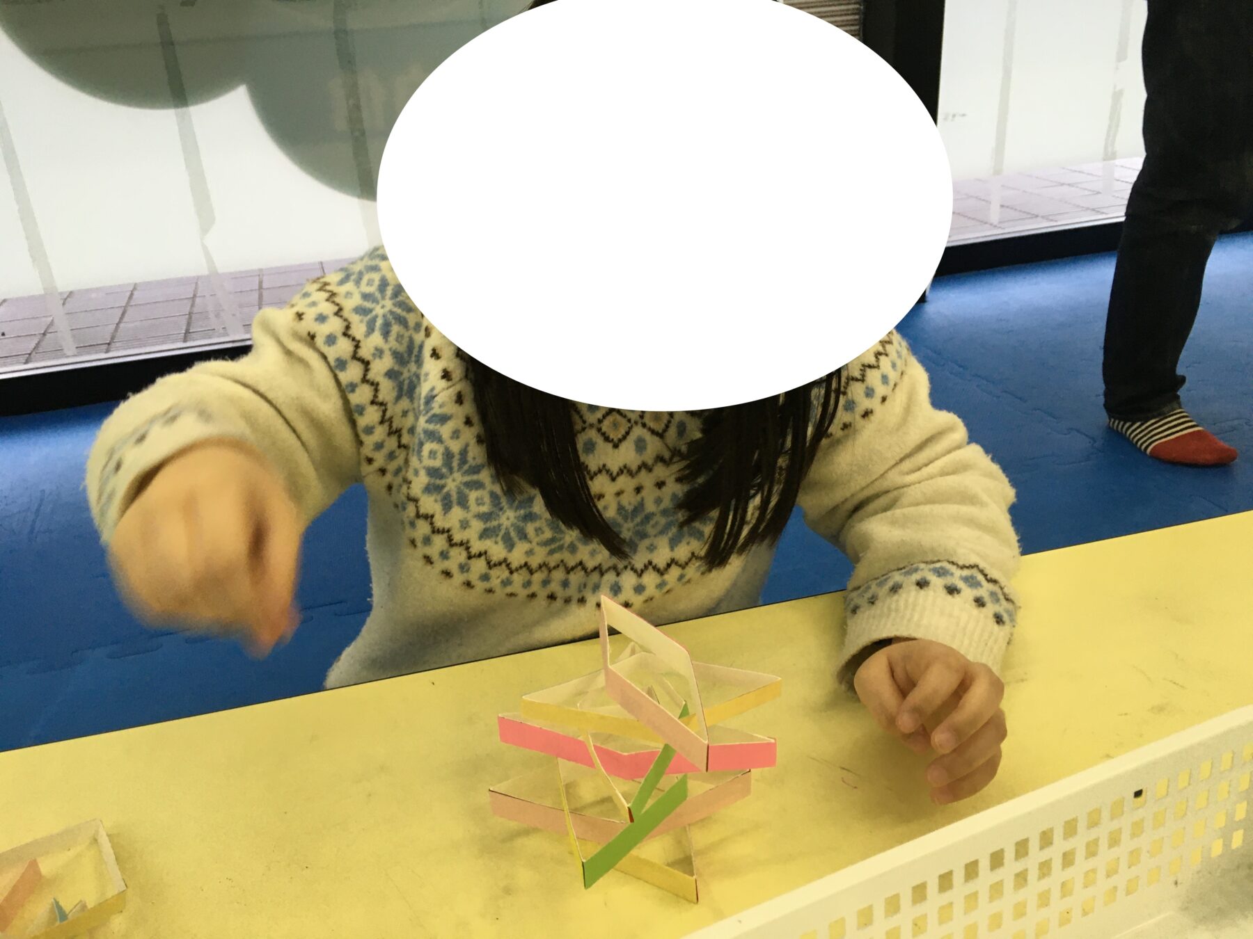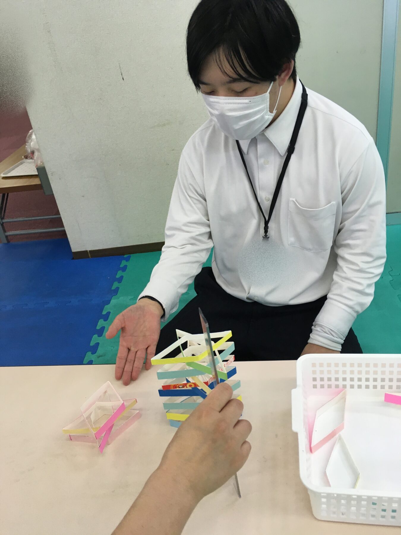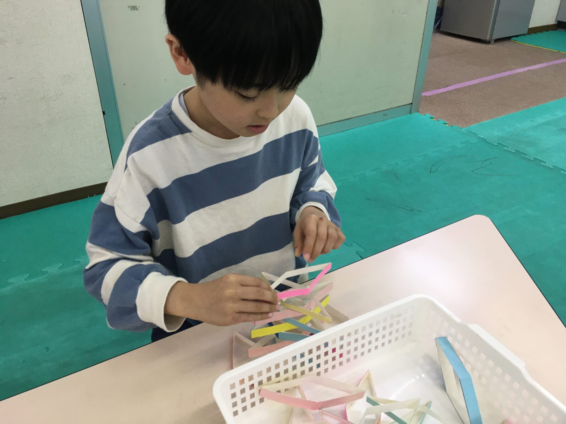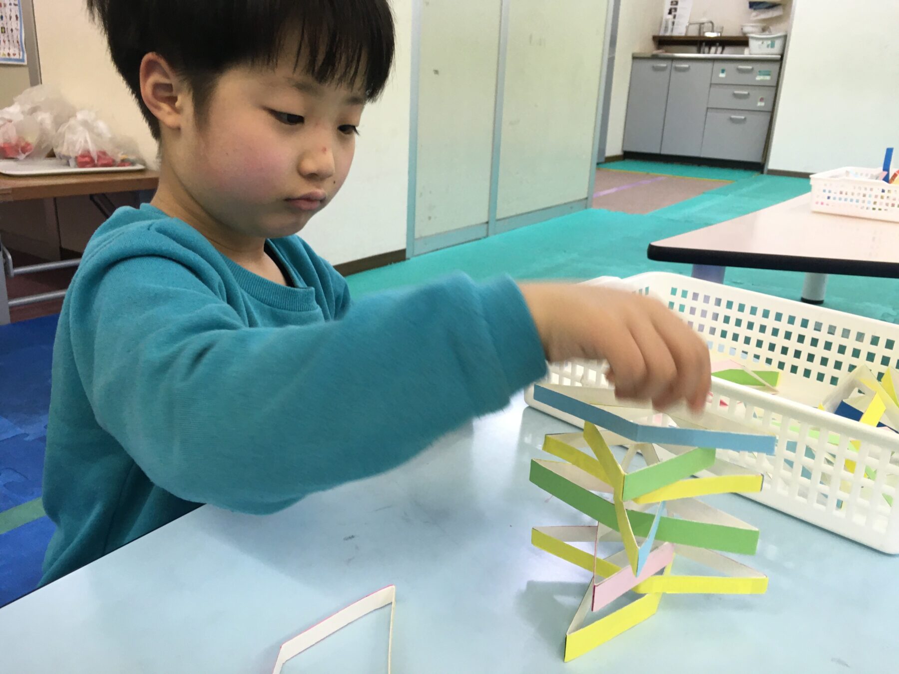 今日は【感覚・認知】の活動で、牛乳パックを細長く切ったものを積み上げていく