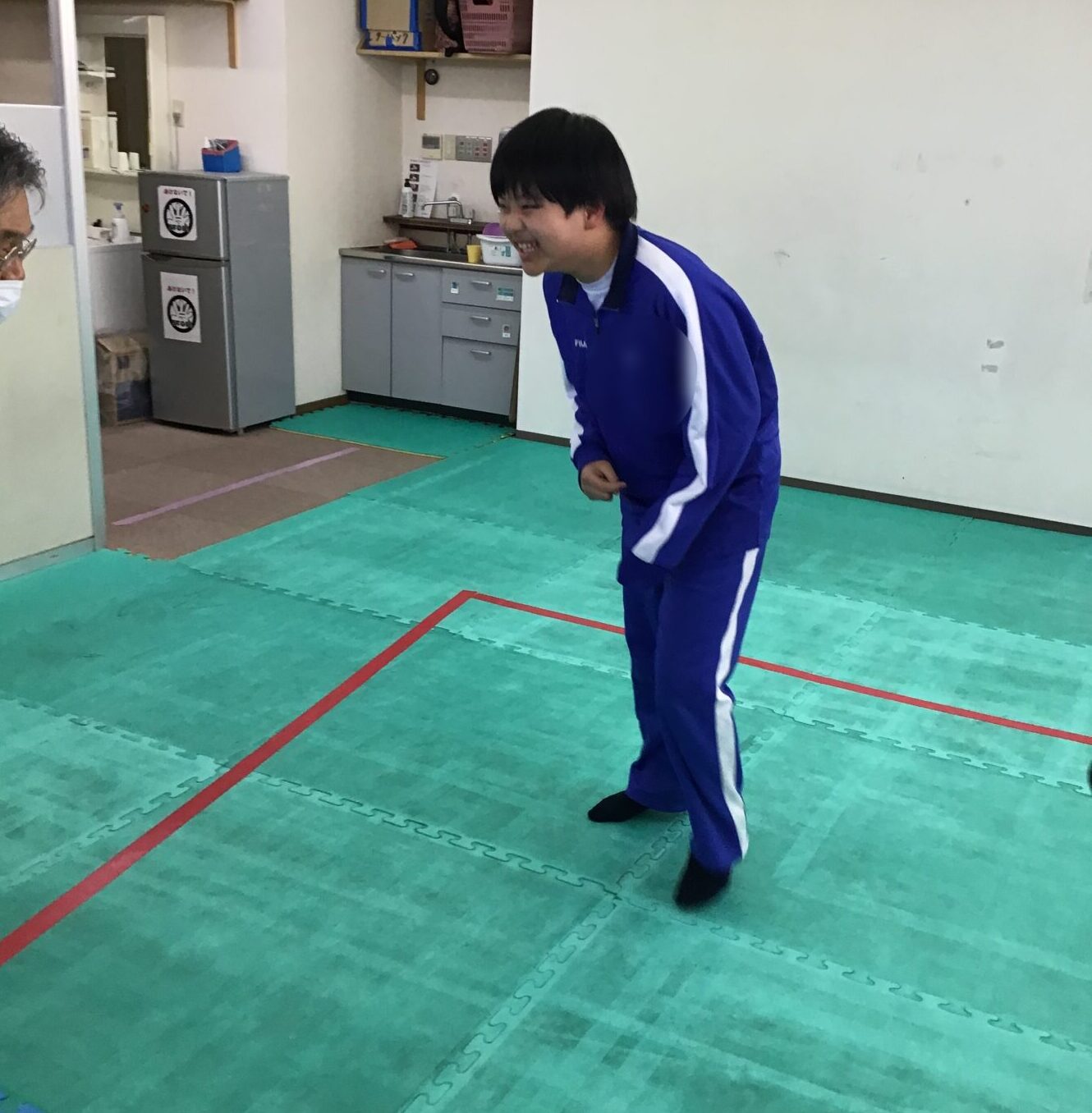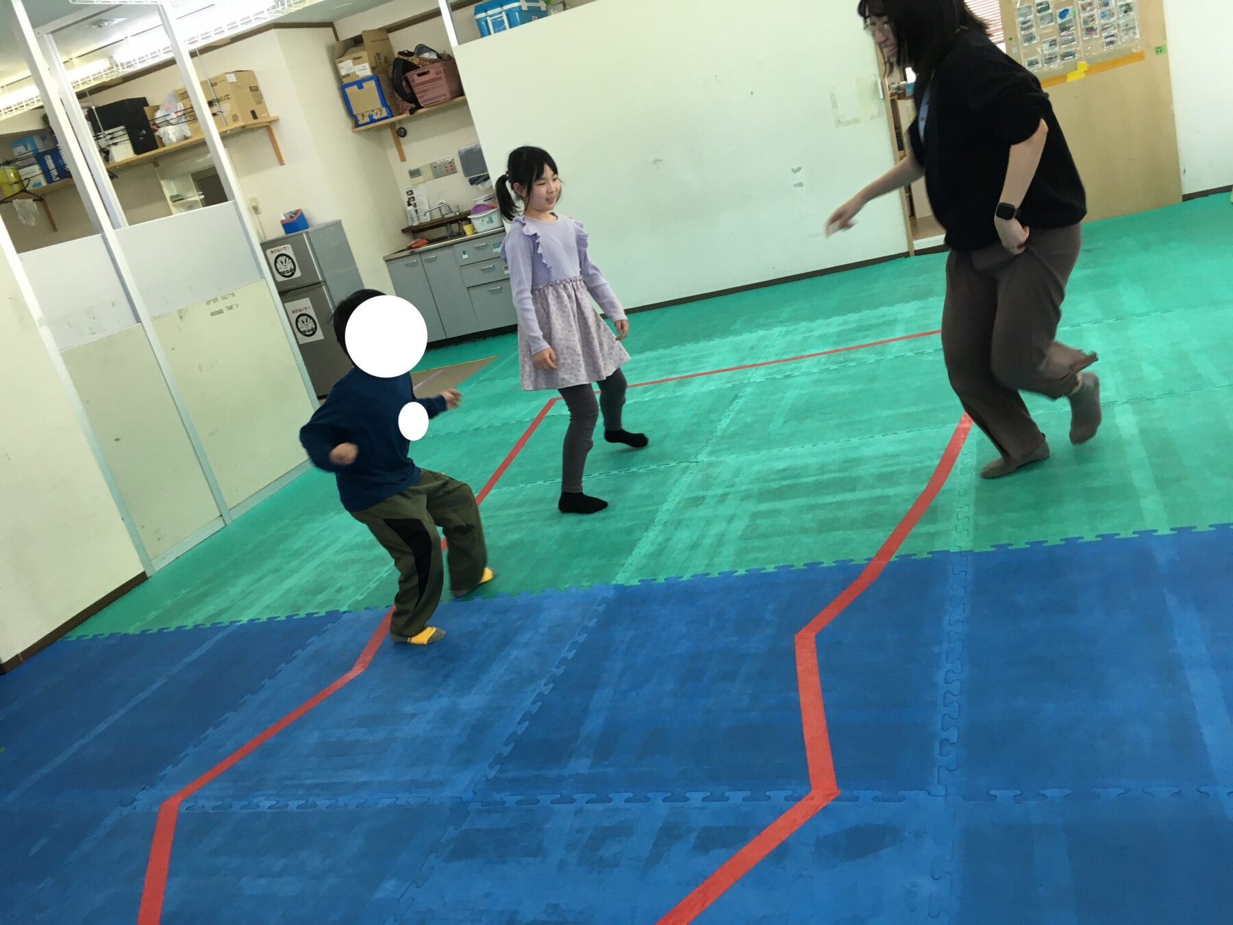 フロアにテープで貼られたひょうたんの形がお友だちの陣地です。