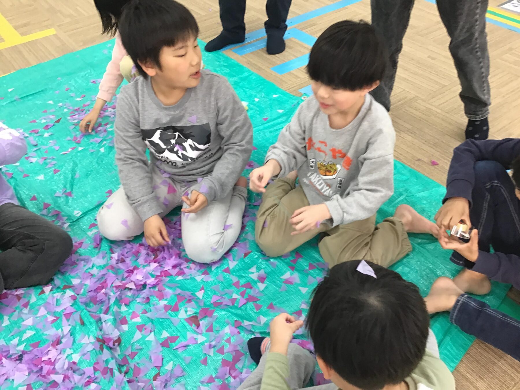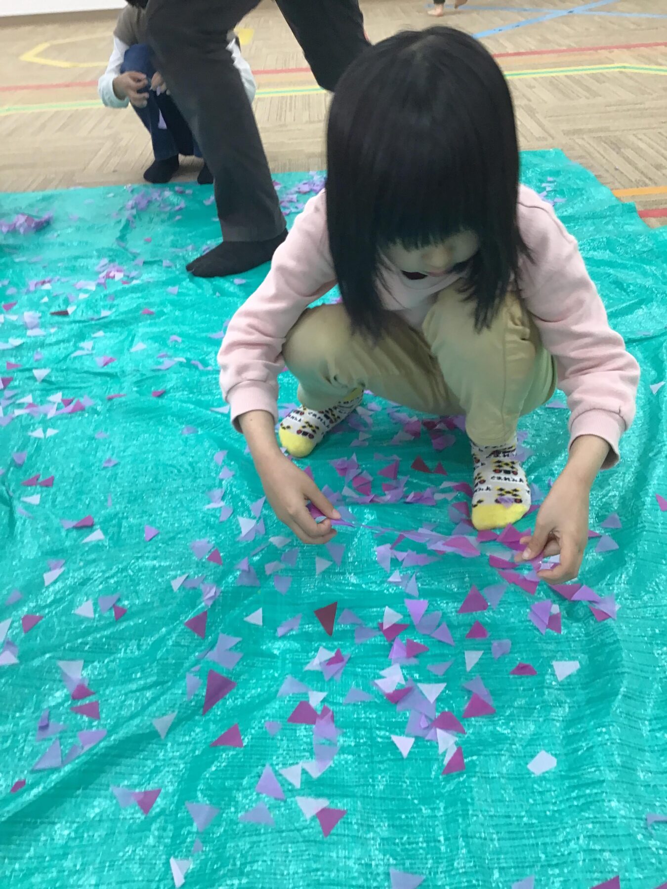 三角に切ったお花紙にながーく切ったセロハンテープをペタ!
